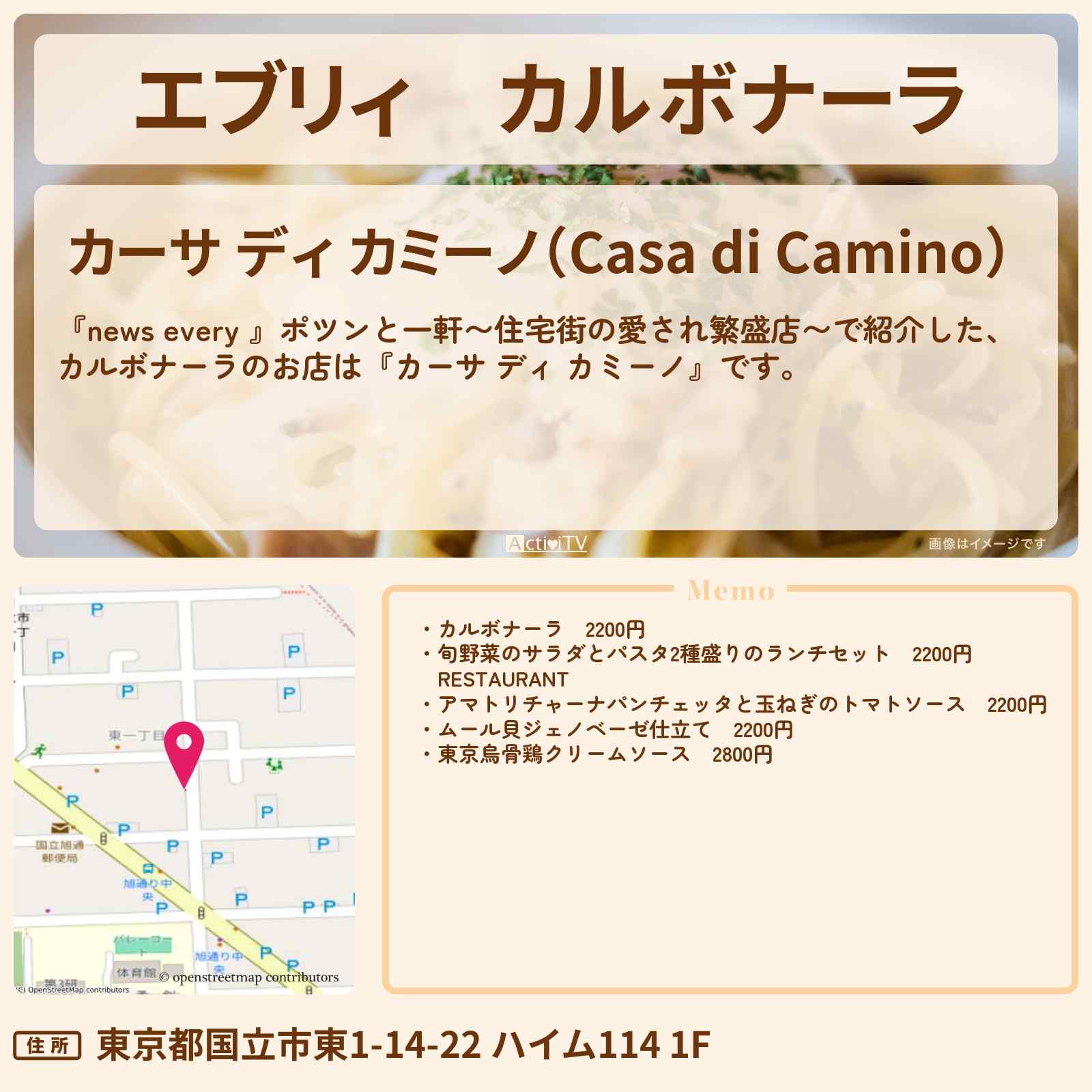 【エブリィ】カルボナーラ『カーサ ディ カミーノ』国立市の住宅街イタリアンお店情報 #every