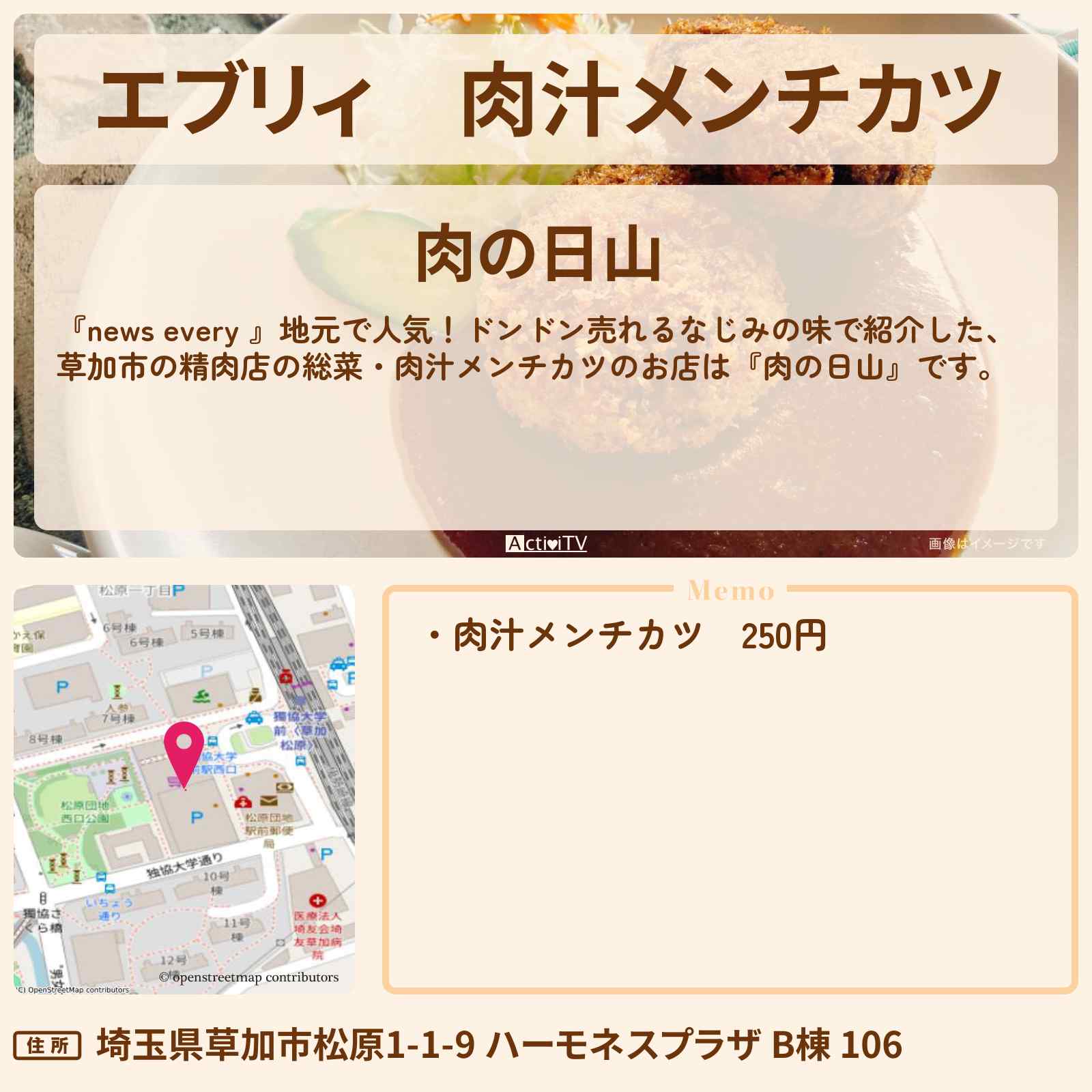 放送の【news every 】地元で人気!ドンドン売れるなじみの味で紹介した、草加市の精肉店の総菜・肉汁メンチカツのお店は『肉の日山』です。