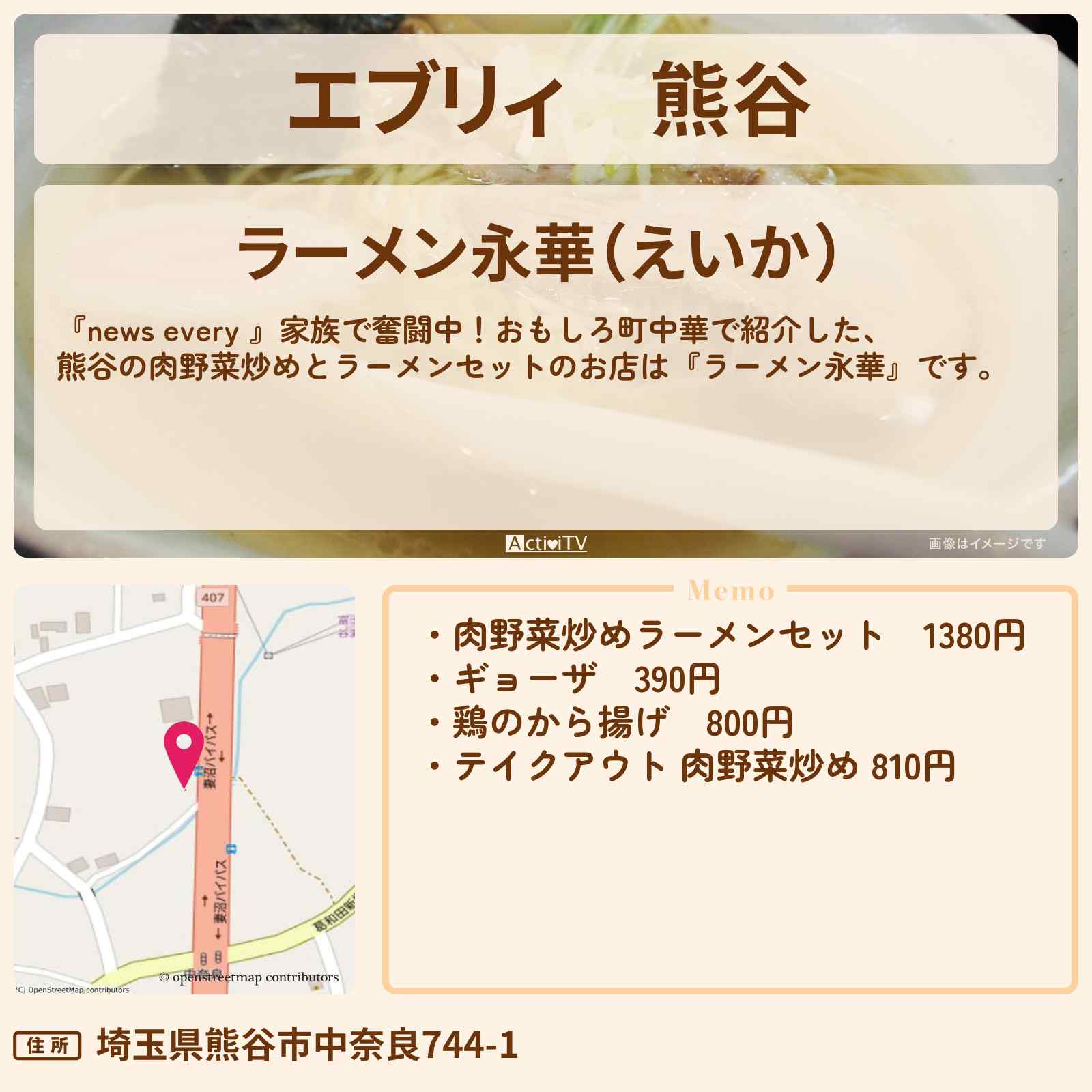 放送の【news every 】家族で奮闘中!おもしろ町中華で紹介した、熊谷の肉野菜炒めとラーメンセットのお店は『ラーメン永華』です。
