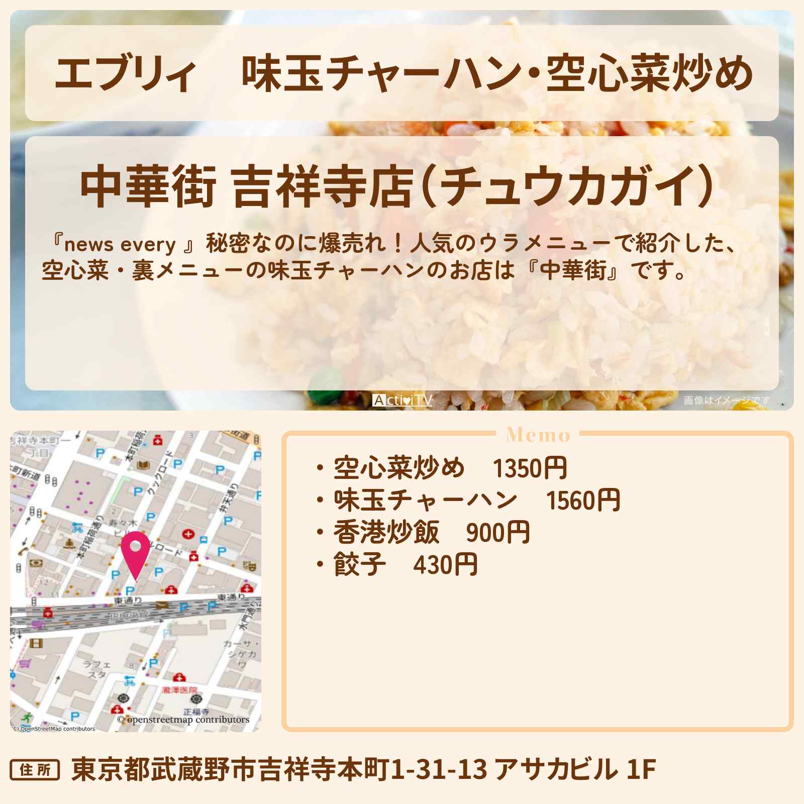 空心菜・チャーハン 吉祥寺駅「中華街 吉祥寺店(チュウカガイ)」