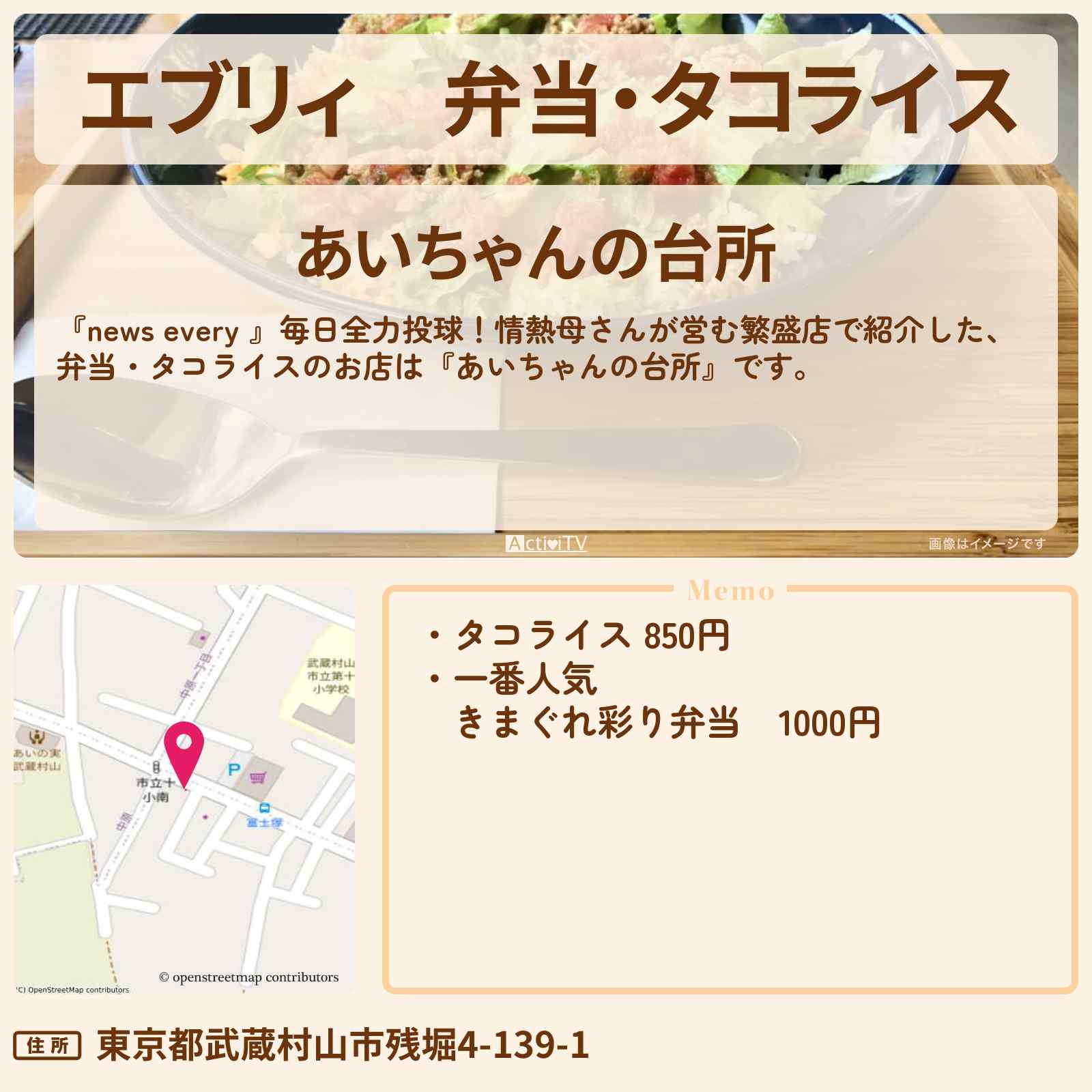 放送の【news every 】毎日全力投球!情熱母さんが営む繁盛店で紹介した、弁当・タコライスのお店は『あいちゃんの台所』です。