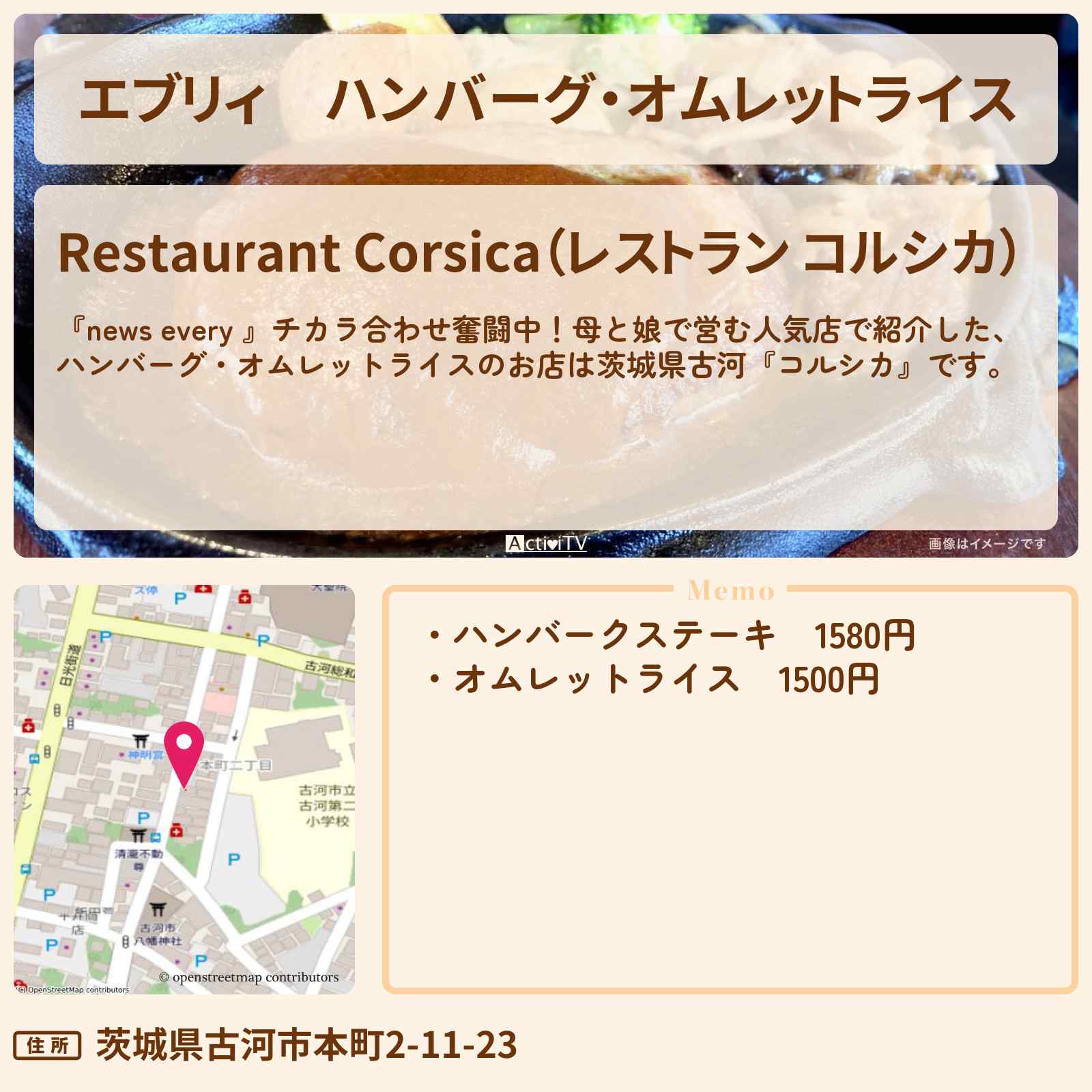ハンバーグ・オムレットライス 古河駅「Restaurant Corsica(レストラン コルシカ)」