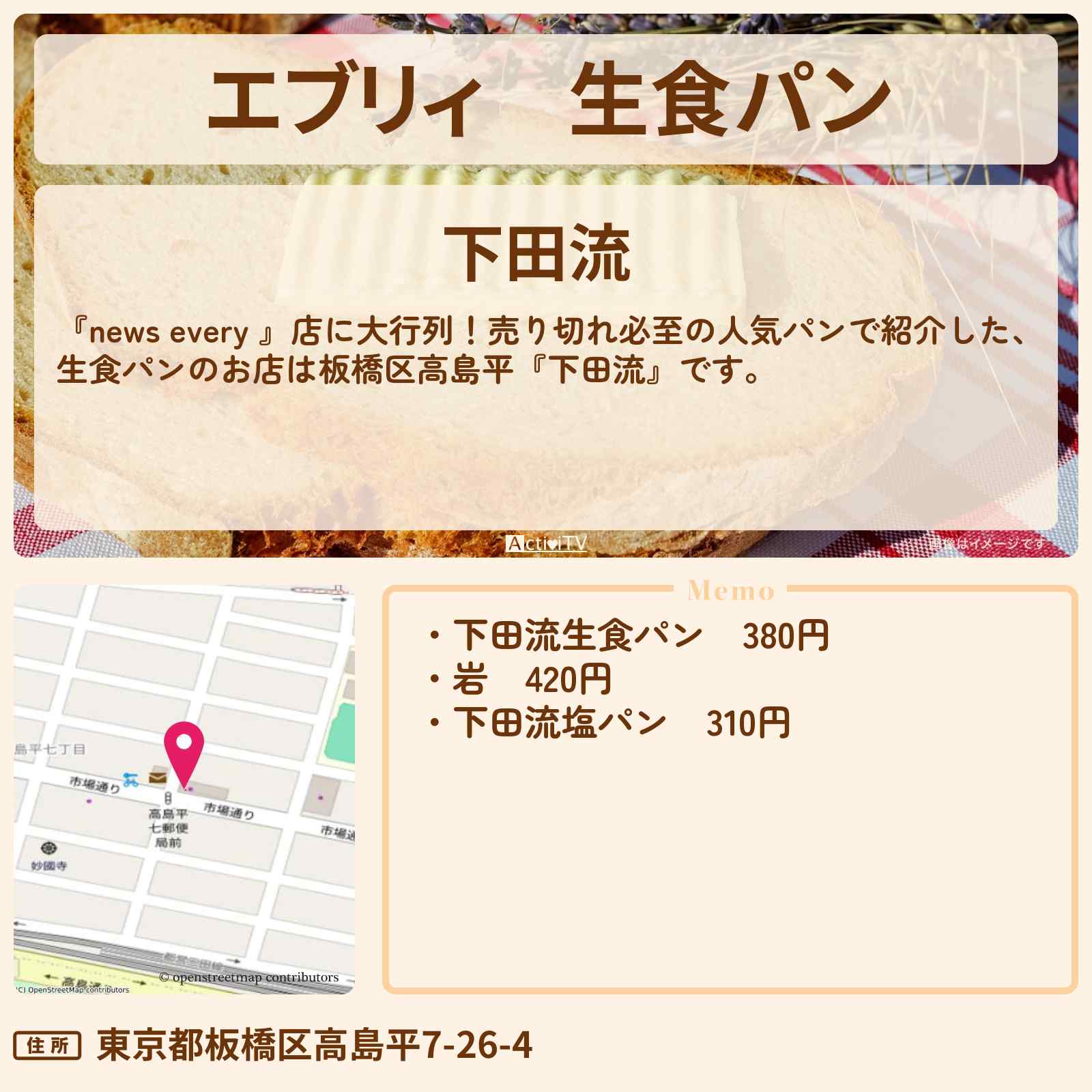 都営三田線高島平駅から徒歩約7分の市場通り沿いにあり、元コンビニエンスストアだった建物を改装した店舗で営業しています。下田さんは板橋区下赤塚の名店BOULANGERIE KEN(ブランジェリー ケン)で修業を積み、在職中から定休日に作るオリジナルパンが話題となり、店内にポップアップショップが設けられるほどの人気を博していました。店主の田崎健一郎さんから「パン作りは常識にとらわれなくていい」という教えを受け、独自の解釈でおいしいパンを創りたいという想いから独立に至りました。