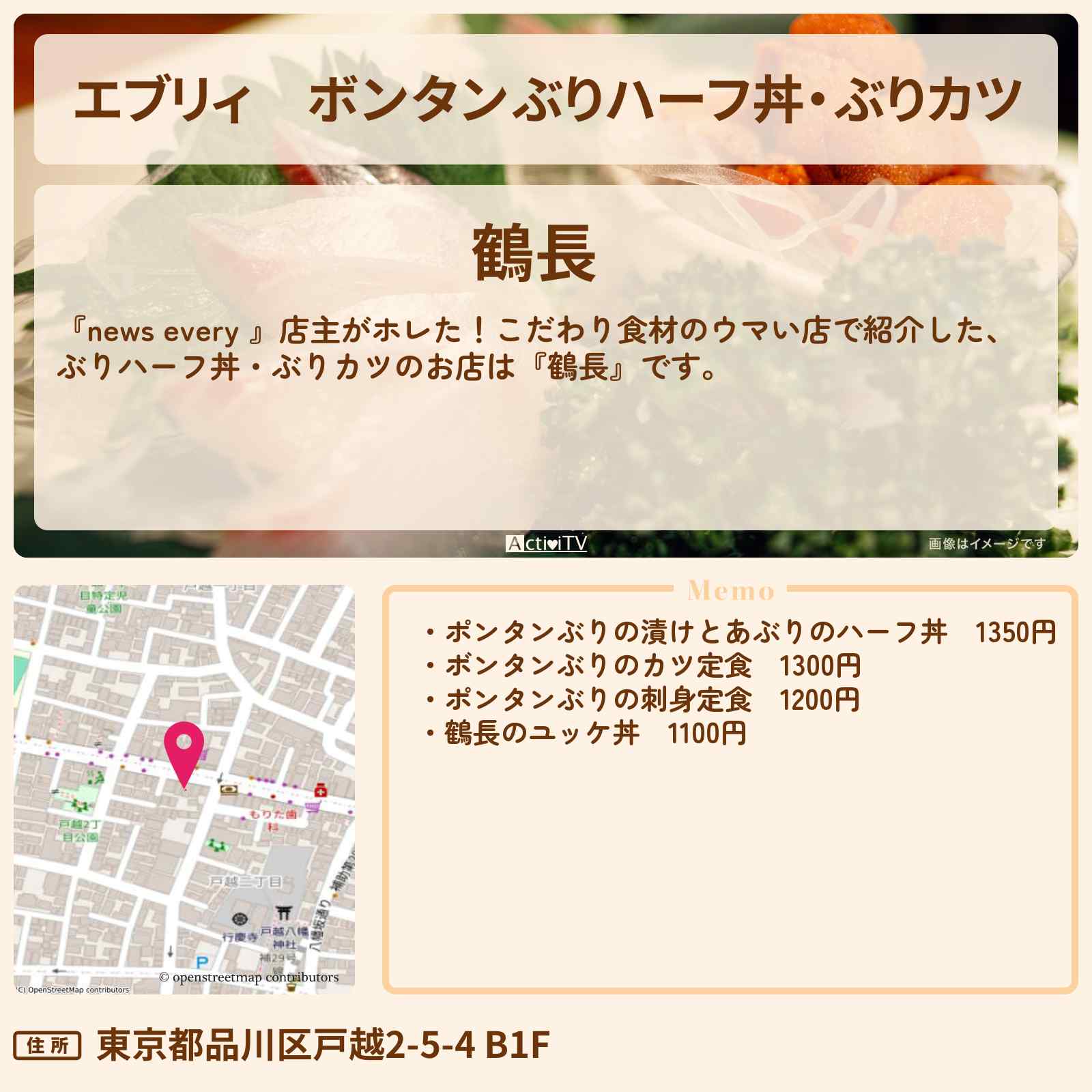 放送の【news every 】店主がホレた!こだわり食材のウマい店で紹介した、ぶりハーフ丼・ぶりカツのお店は『鶴長』です。