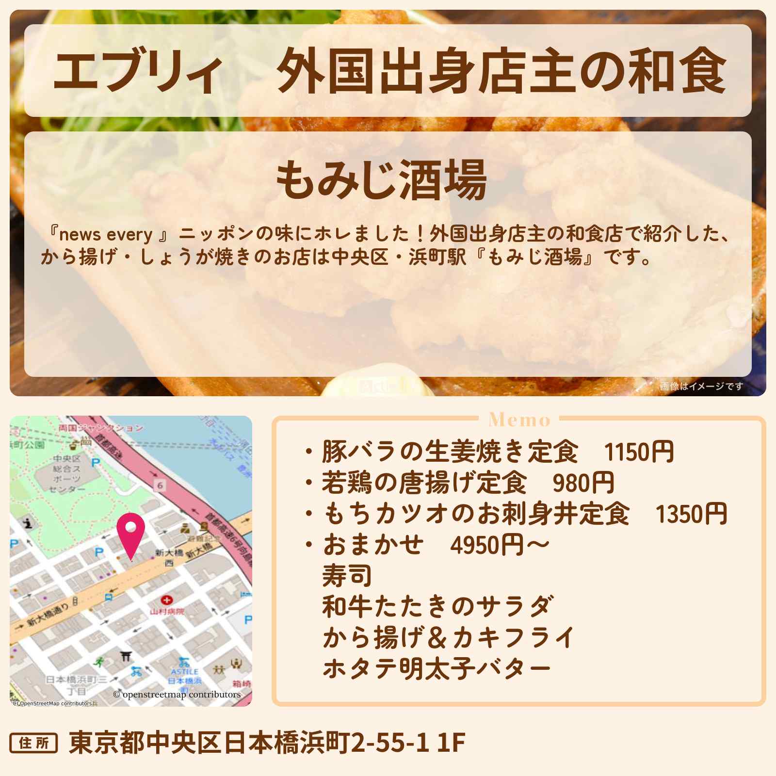 放送の【news every 】ニッポンの味にホレました!外国出身店主の和食店で紹介した、から揚げ・しょうが焼きのお店は中央区・浜町駅『もみじ酒場』です。