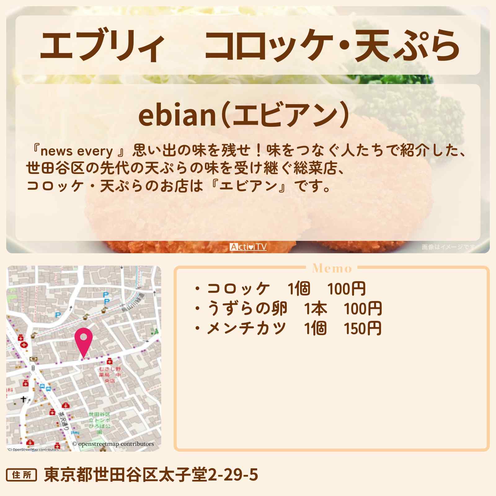 コロッケ・天ぷら 三軒茶屋駅「ebian(エビアン)」