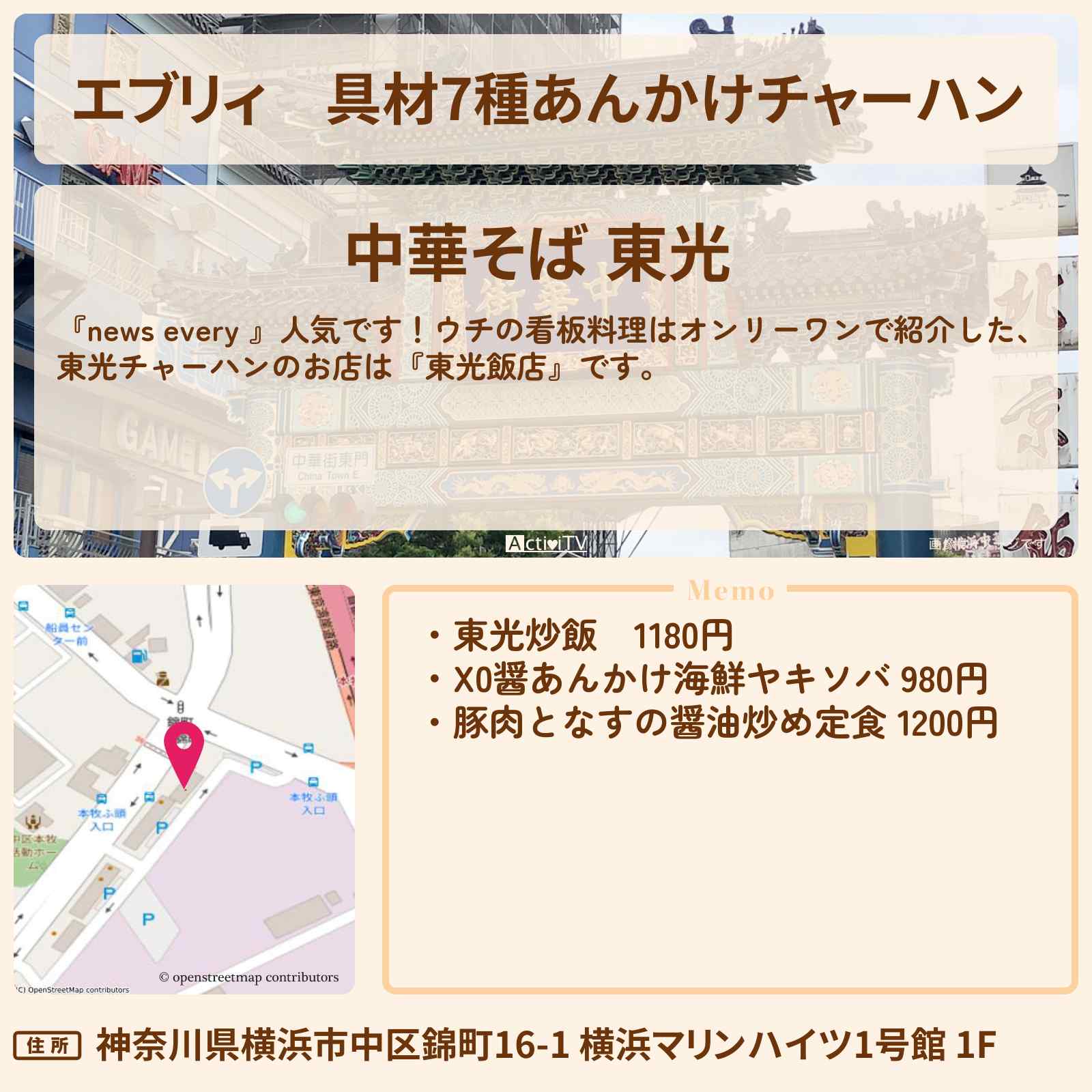 【エブリィ】具材7種あんかけチャーハン『中華そば 東光』横浜市 オンリーワン看板料理のお店情報 #every