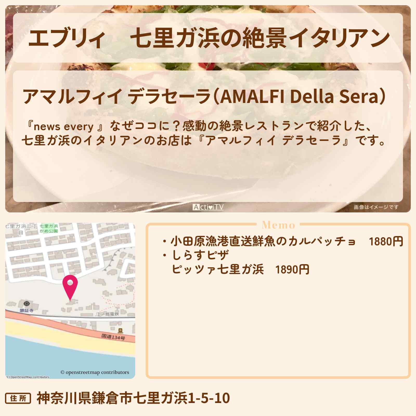 放送の【news every 】なぜココに?感動の絶景レストランで紹介した、七里ガ浜のイタリアンのお店は『アマルフィイ デラセーラ』です。