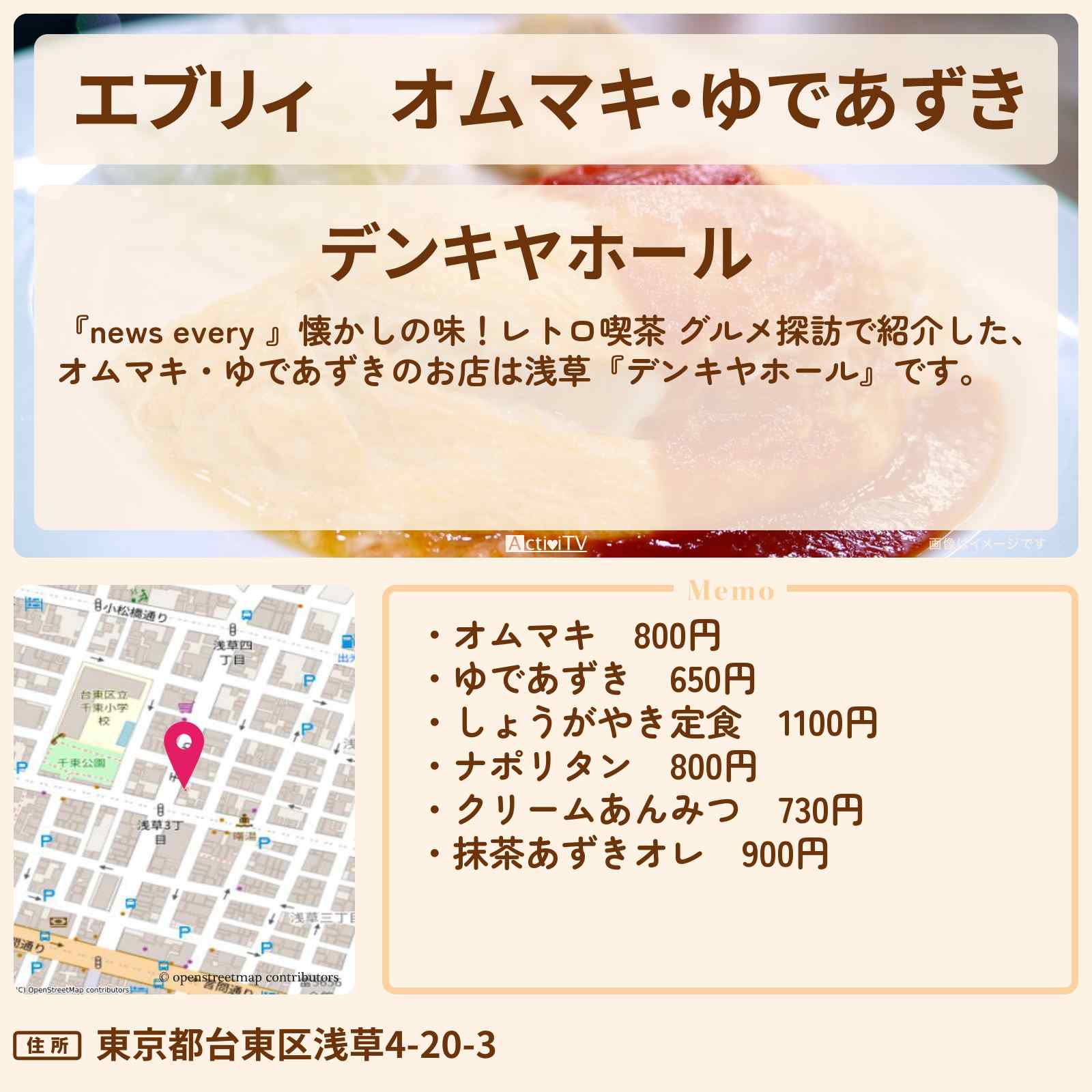 放送の【news every 】懐かしの味!レトロ喫茶 グルメ探訪で紹介した、オムマキ・ゆであずきのお店は浅草『デンキヤホール』です。