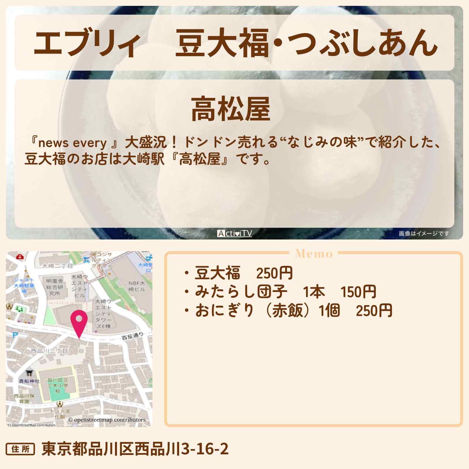 高松屋の看板商品は豆大福です。北海道十勝産のえりもしょうずで作るつぶしあんに、大きな赤えんどう豆を加え、歯切れのよい餅生地でふんわりと包み込みました。