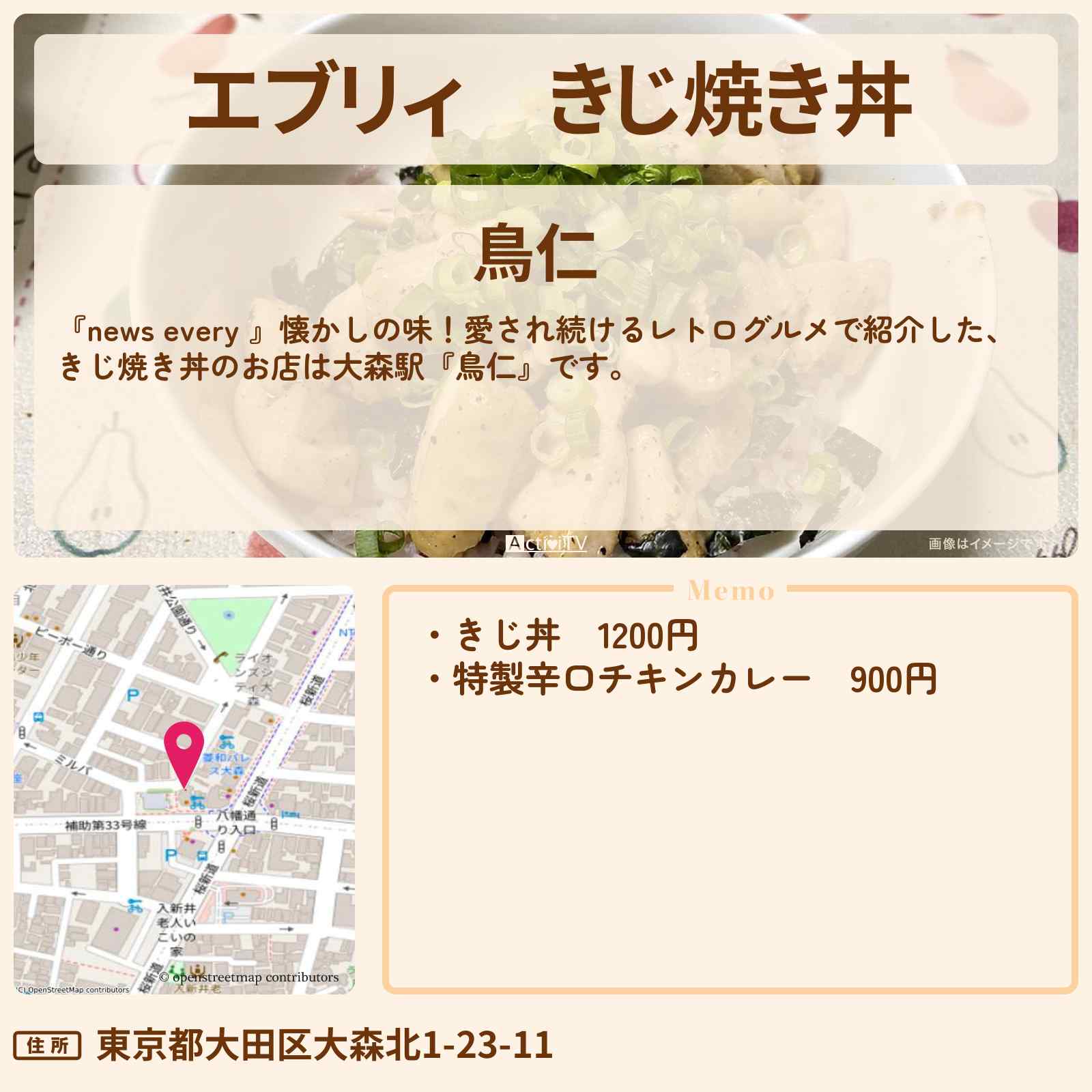 このお店の名物は何と言ってもきじ丼です。店名の由来にもなっている料理で、鶏のもも肉を生地のように薄く開いてから炭火で焼き上げています。50年以上前から継ぎ足して使い続けているという秘伝のたれが鶏肉に深い味わいをもたせ、紀州の備長炭でじっくりと焼くことで表面には香ばしい焦げ目がつきます。丼の上にはたっぷりと海苔が散らされていますが、これは大森が江戸時代から昭和38年まで約300年にわたって海苔養殖で栄えた歴史に由来します。明治から昭和初期にかけて日本一の海苔生産地だった大森の名残として、今でも多くの海苔問屋が地域に残っており、きじ丼の海苔はこの地域ならではのこだわりとなっています。セットで付く鶏ガラでとったスープとの相性も絶妙で、甘辛いたれと海苔の風味、そして炭火で焼いた香ばしい鶏肉が三位一体となって食べる人を満足させます。
