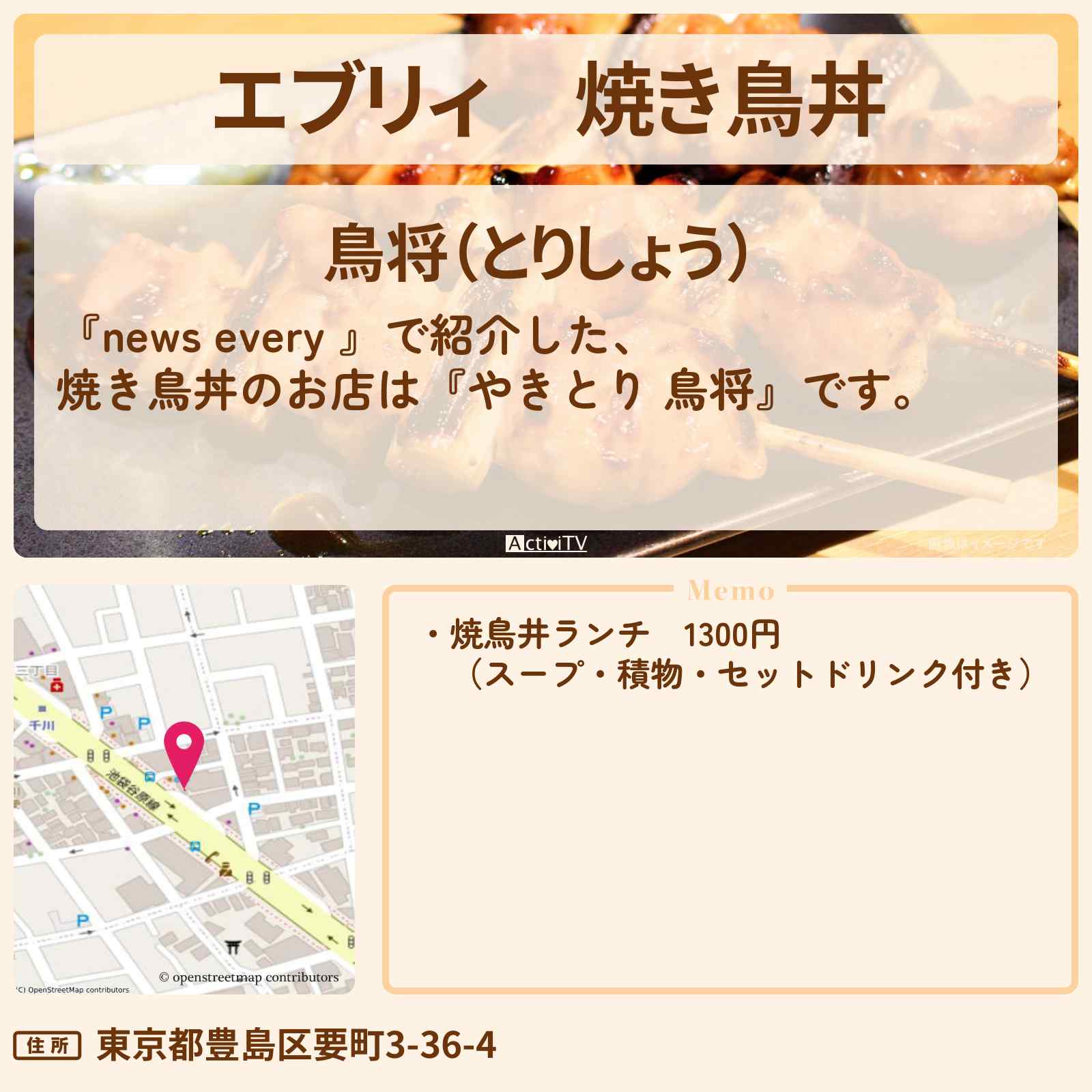 放送の【news every 】で紹介した、焼き鳥丼のお店は『やきとり 鳥将』です。