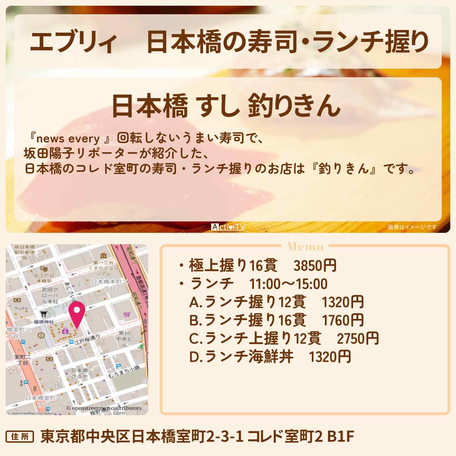 【エブリィ】日本橋の寿司・ランチ握り『釣りきん』回転しないうまい寿司のお店情報 #every
