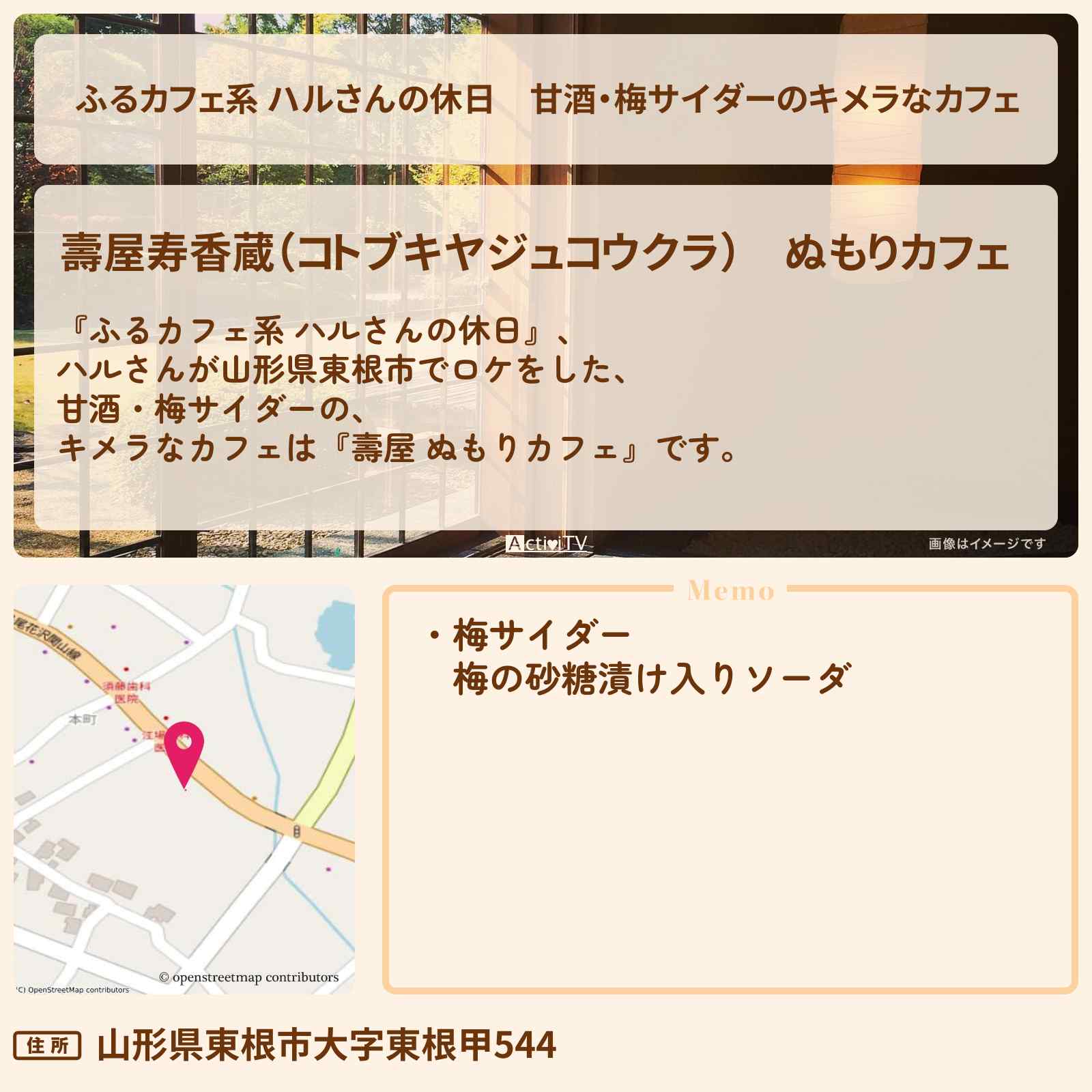 東根市は、さくらんぼで有名なフルーツ王国であり、また蔵王国としても知られています。そんな土地柄を反映するかのように、ぬもりカフェは築129年という歴史ある建物に身を置いています。