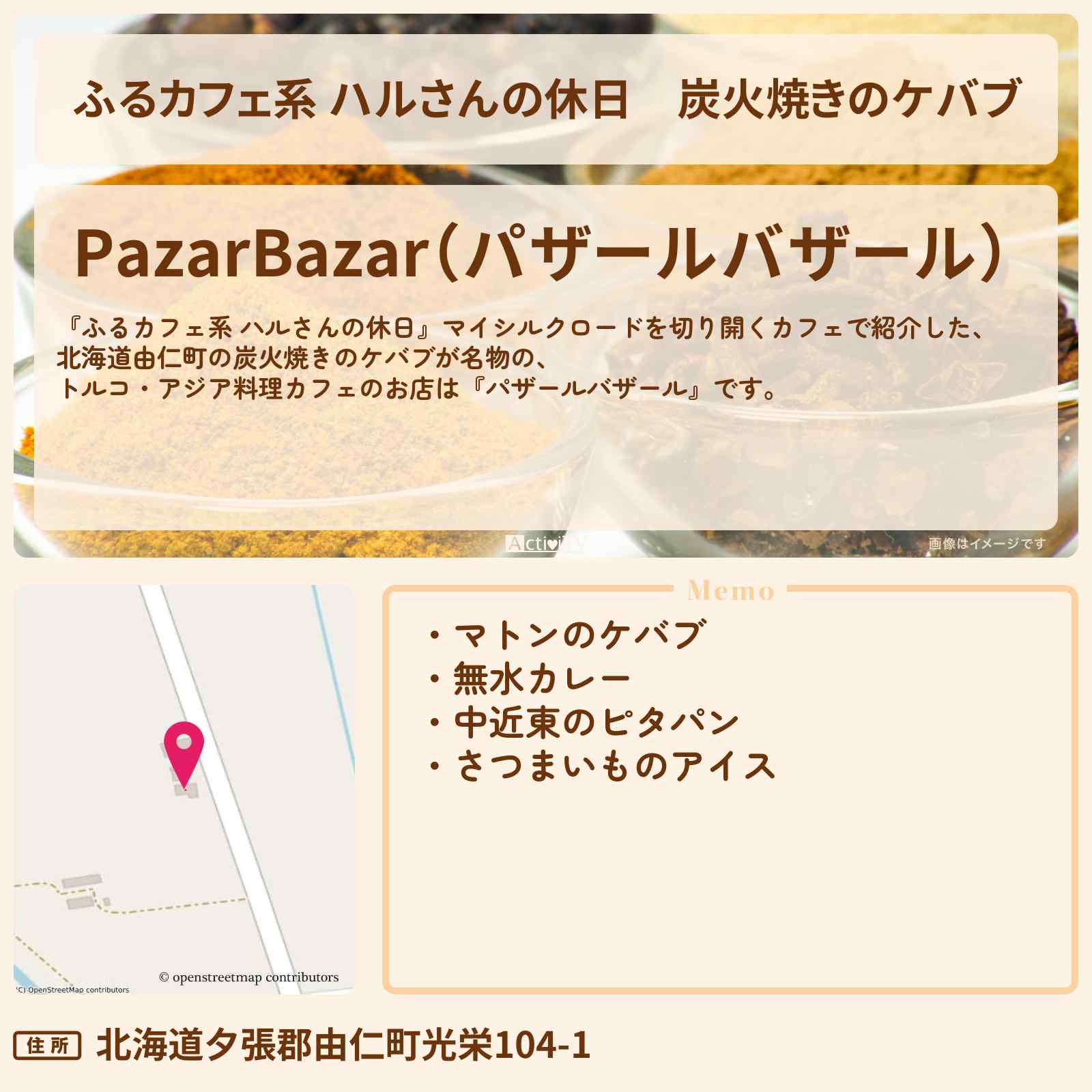 放送の【ふるカフェ系 ハルさんの休日】マイシルクロードを切り開くカフェで紹介した、北海道由仁町の炭火焼きのケバブが名物の、トルコ・アジア料理カフェのお店は『パザールバザール』です。