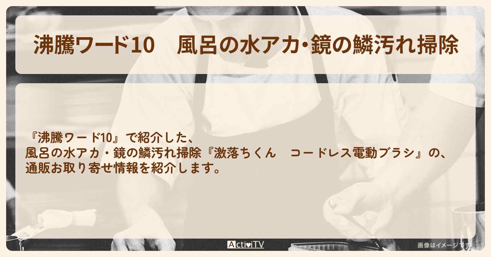 放送の【沸騰ワード10】で紹介した、風呂の水アカ・鏡の鱗汚れ掃除『激落ちくん コードレス電動ブラシ』の、通販お取り寄せ情報を紹介します。