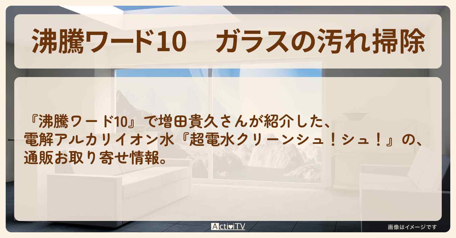 放送の【沸騰ワード10】で増田貴久さんが紹介した、電解アルカリイオン水『超電水クリーンシュ!シュ!』の、通販お取り寄せ情報。