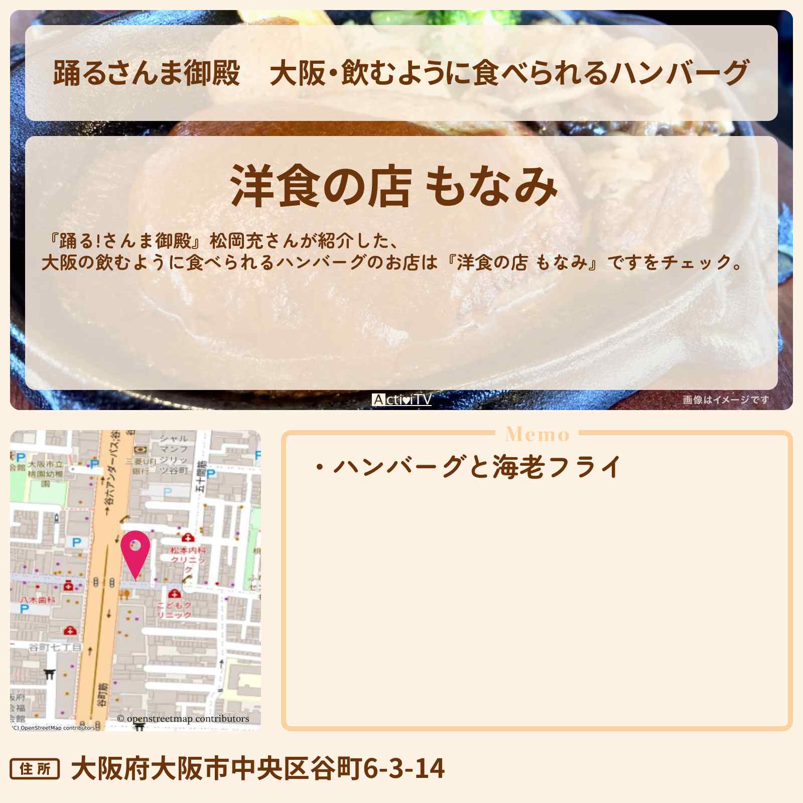 【踊るさんま御殿】大阪・飲むように食べられるハンバーグ 松岡充『洋食の店 もなみ』のお店情報〔SOPHIA〕