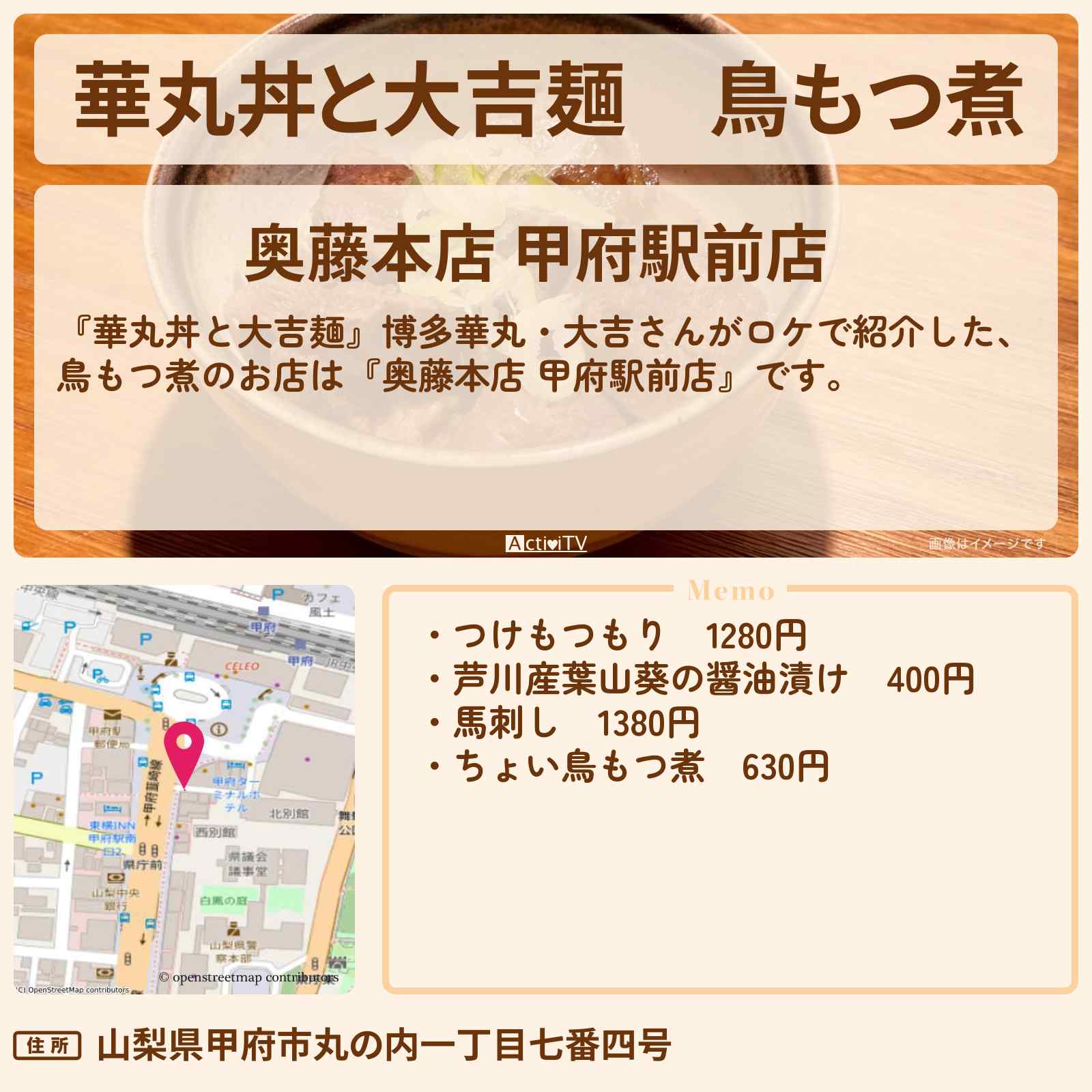 このお店の名物は、昭和25年頃に奥藤本店で誕生した甲府鳥もつ煮です。一般的なもつ煮とは異なり、大鍋でぐつぐつ煮込むのではなく、新鮮な鳥のレバー、ハツ、砂肝、玉道(キンカン)を強火で素早く鍋振りし、砂糖と醤油だけで甘辛く味付けした当地独特の料理となっています。