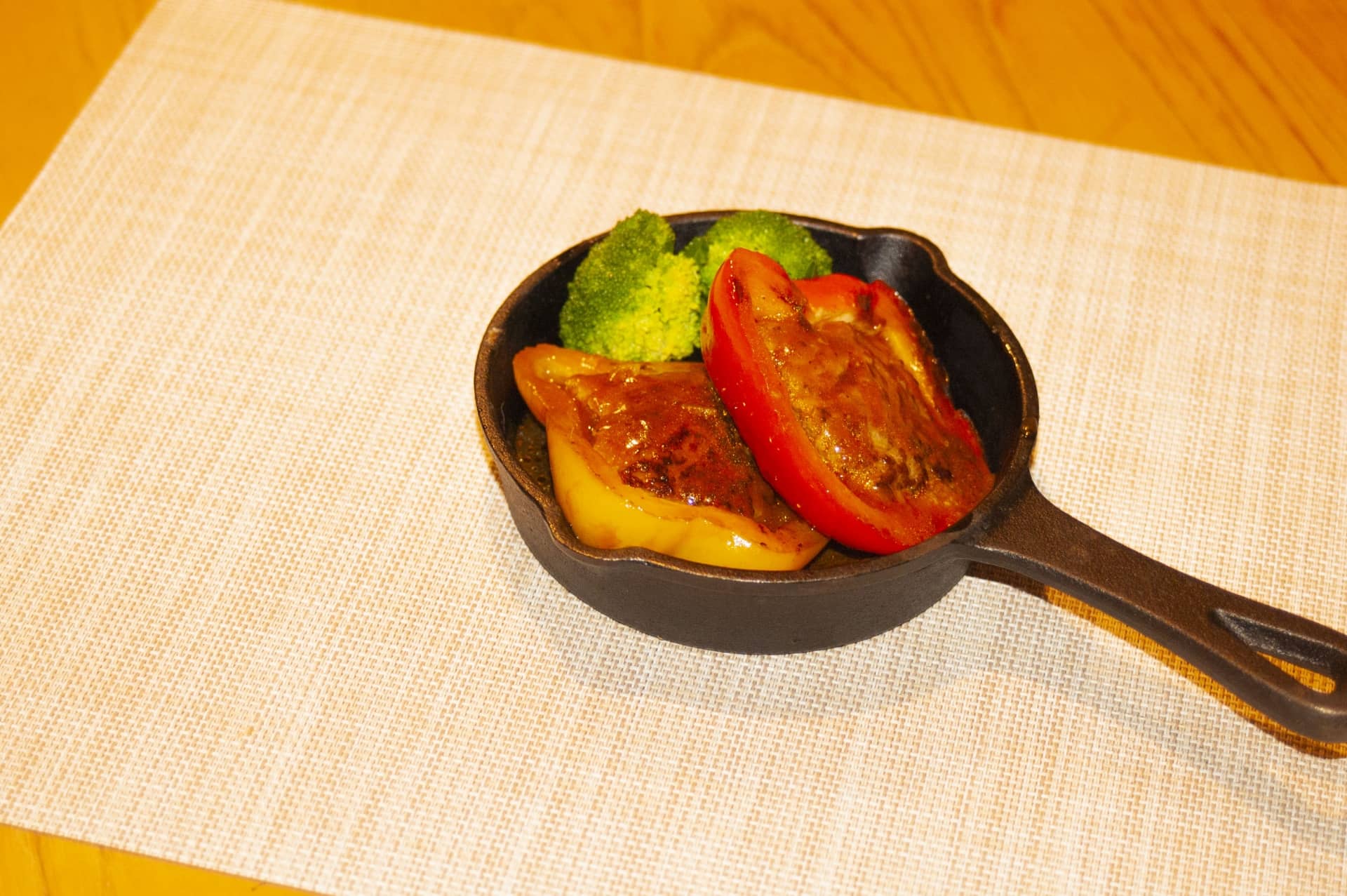 - 加熱したパプリカの肉詰めに鯖缶の煮汁をかける