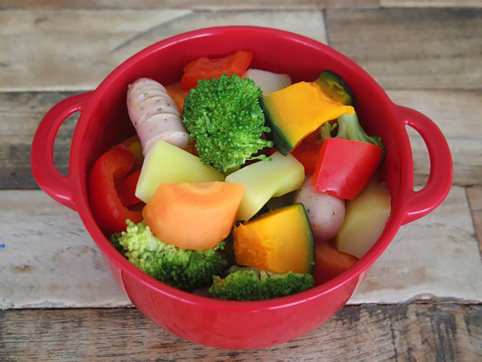 - 具材を入れ、塩・赤唐辛子・ミニトマトを加えて約5分加熱