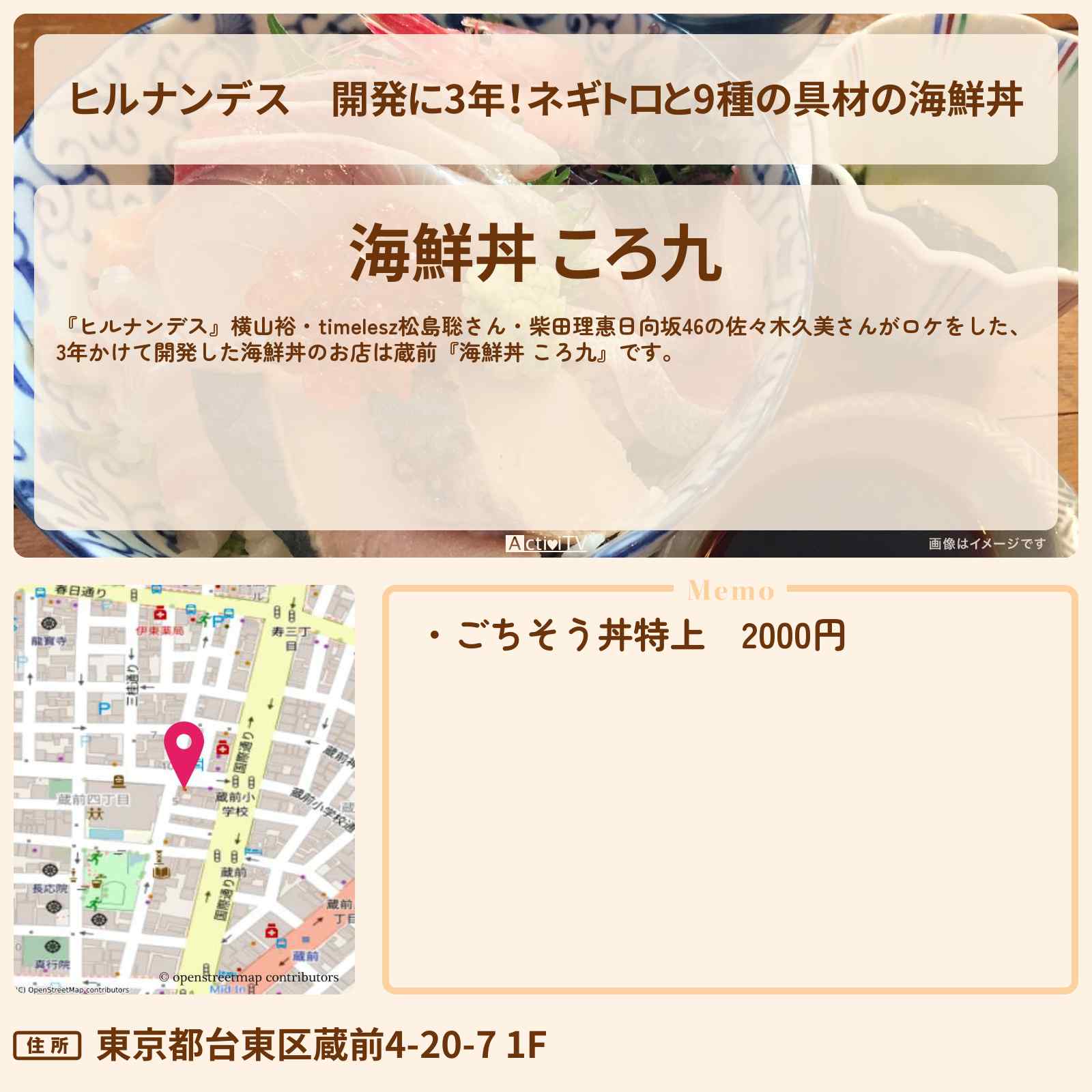 放送の【ヒルナンデス】横山裕・timelesz松島聡さん・柴田理惠日向坂46の佐々木久美さんがロケをした、3年かけて開発した海鮮丼のお店は蔵前『海鮮丼 ころ九』です。