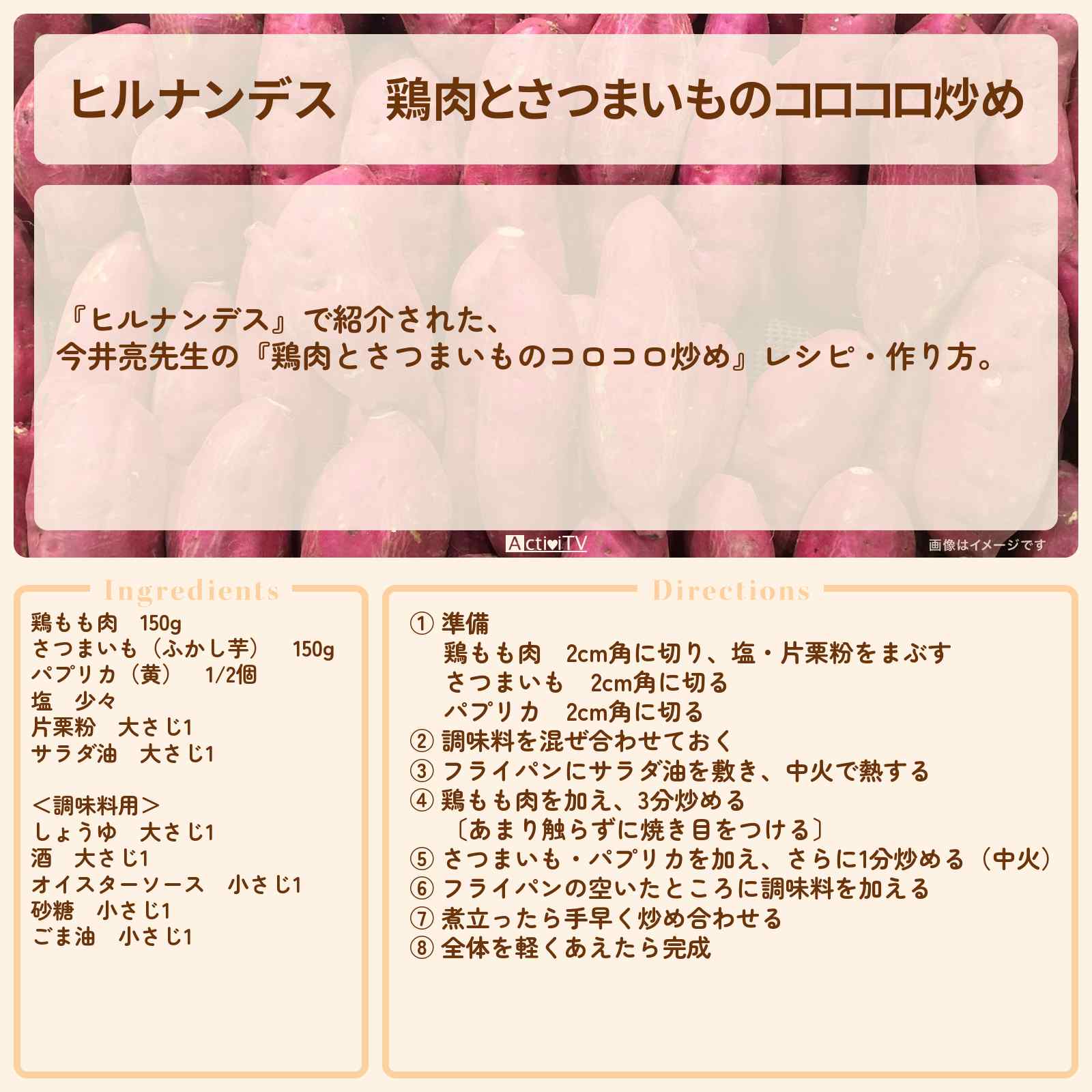 放送の【ヒルナンデス】で紹介された、今井亮先生の『鶏肉とさつまいものコロコロ炒め』レシピ・作り方。
