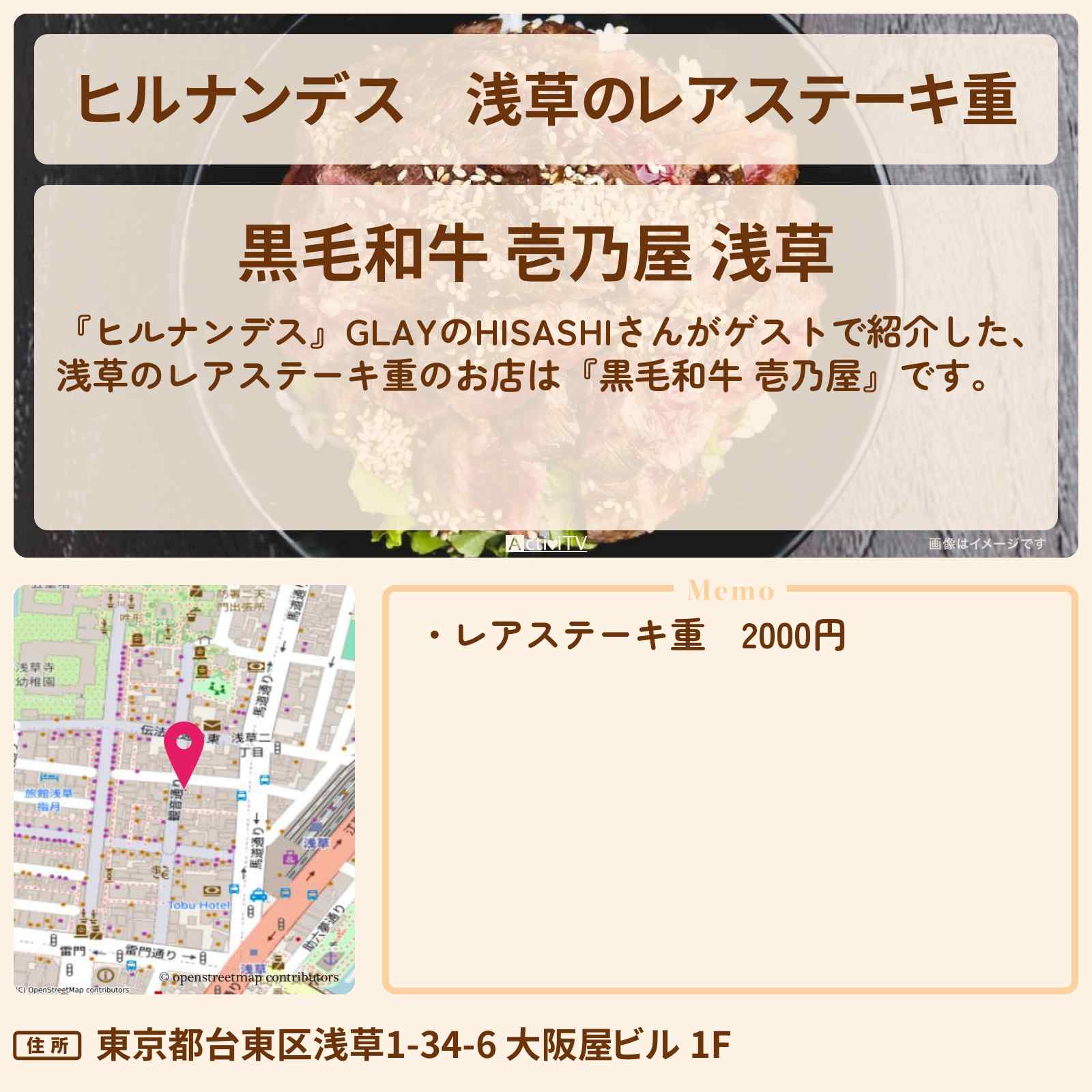放送の【ヒルナンデス】GLAYのHISASHIさんがゲストで紹介した、浅草のレアステーキ重のお店は『黒毛和牛 壱乃屋』です。
