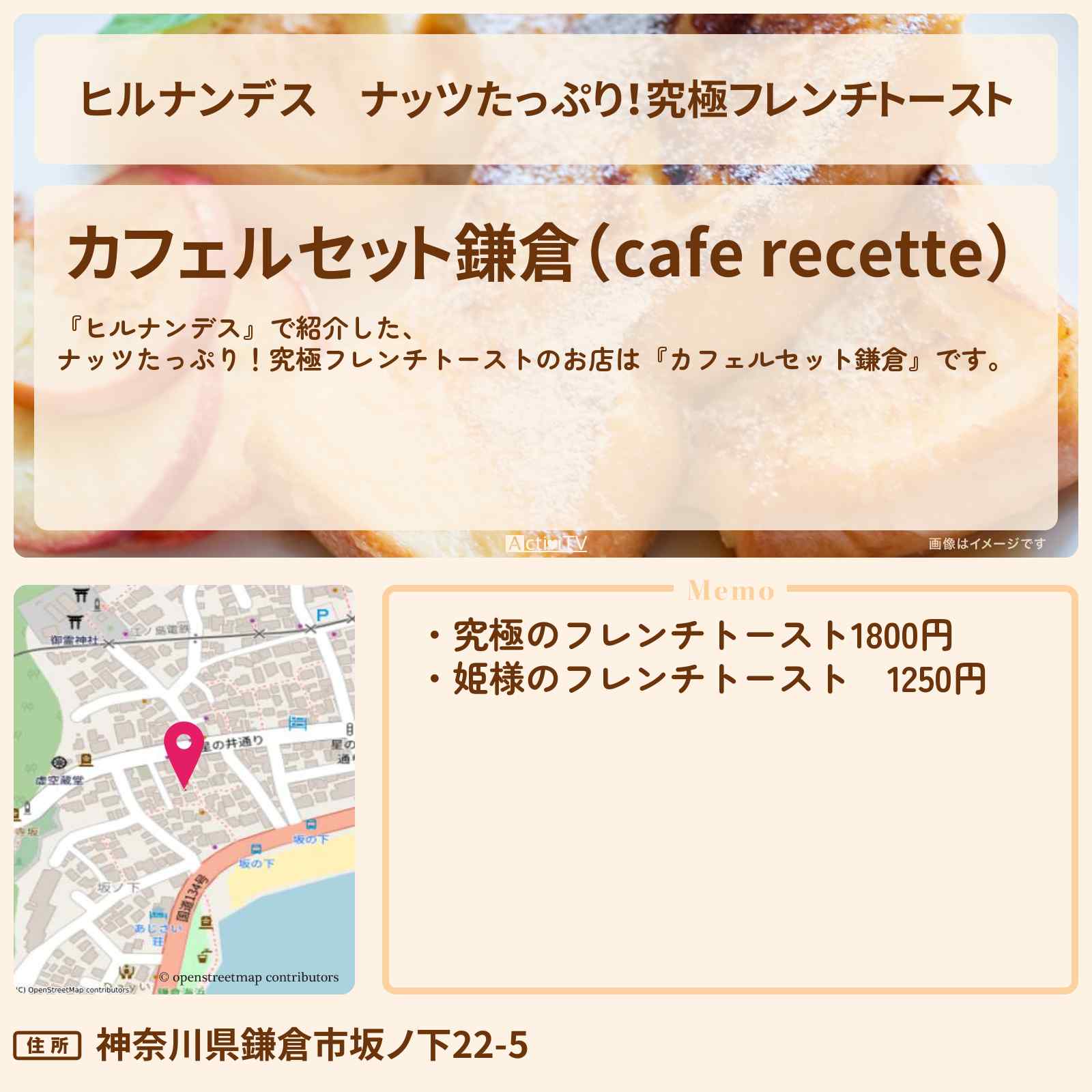 放送の【ヒルナンデス】で紹介した、ナッツたっぷり!究極フレンチトーストのお店は『カフェルセット鎌倉』です。