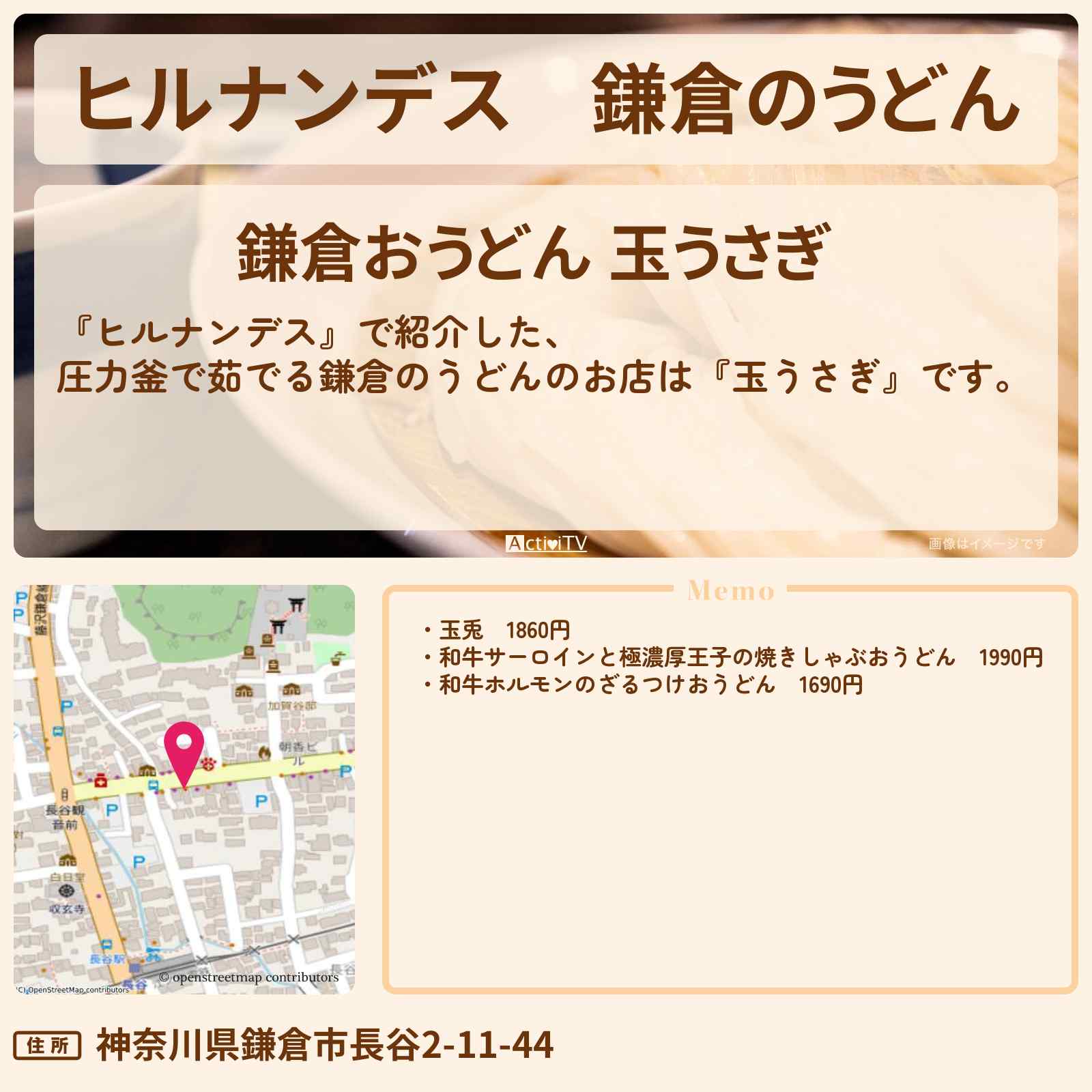 放送の【ヒルナンデス】で紹介した、圧力釜で茹でる鎌倉のうどんのお店は『玉うさぎ』です。
