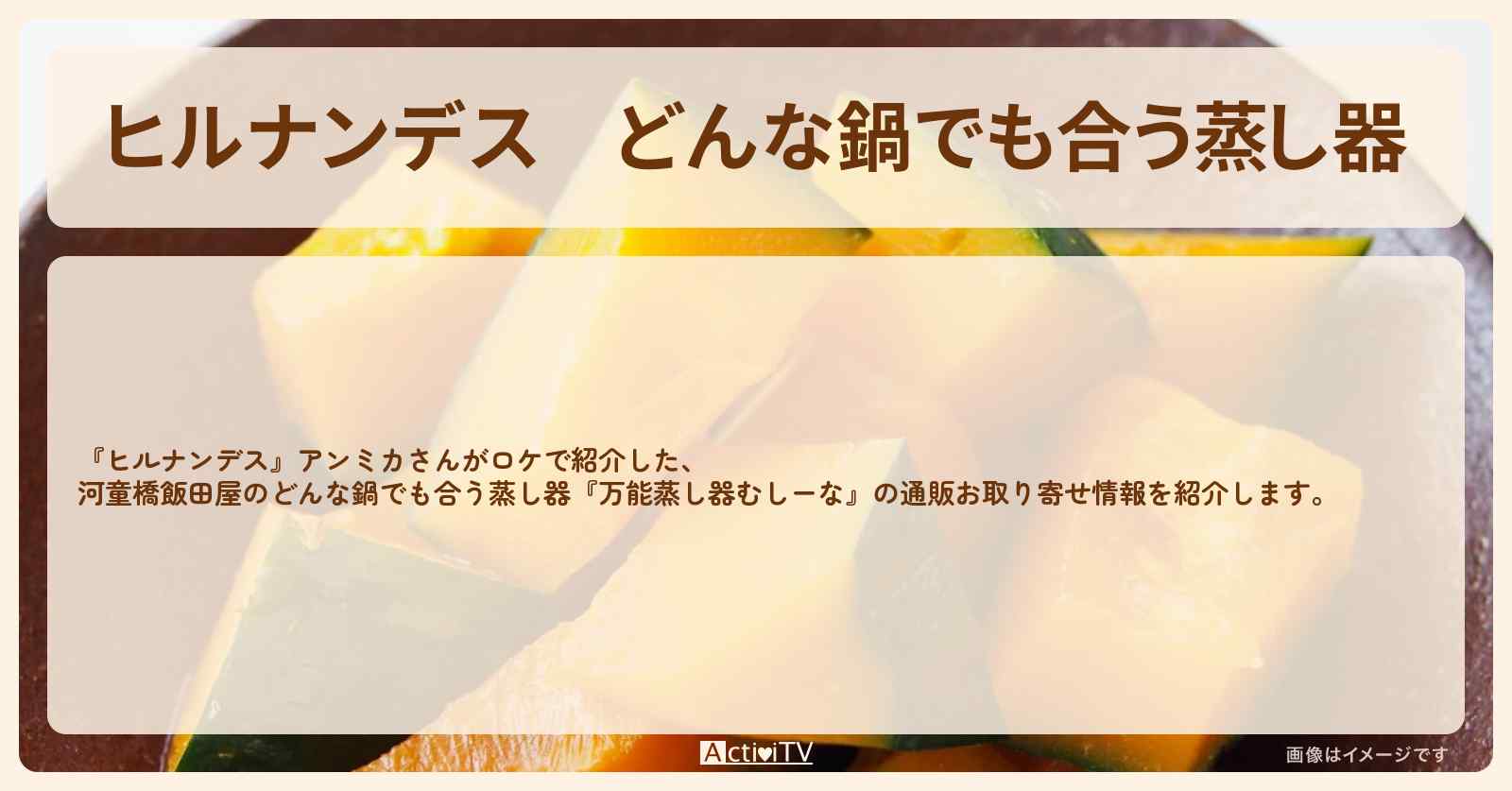 放送の【ヒルナンデス】アンミカさんがロケで紹介した、河童橋飯田屋のどんな鍋でも合う蒸し器『万能蒸し器むしーな』の通販お取り寄せ情報を紹介します。