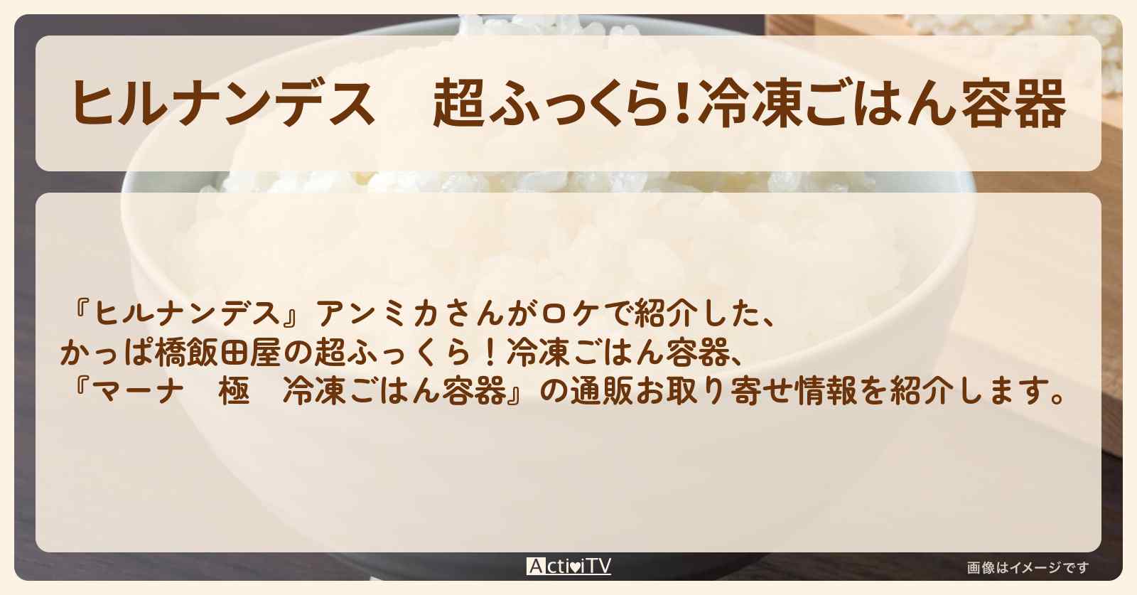 放送の【ヒルナンデス】アンミカさんがロケで紹介した、かっぱ橋飯田屋の超ふっくら!冷凍ごはん容器、『マーナ 極 冷凍ごはん容器』の通販お取り寄せ情報を紹介します。