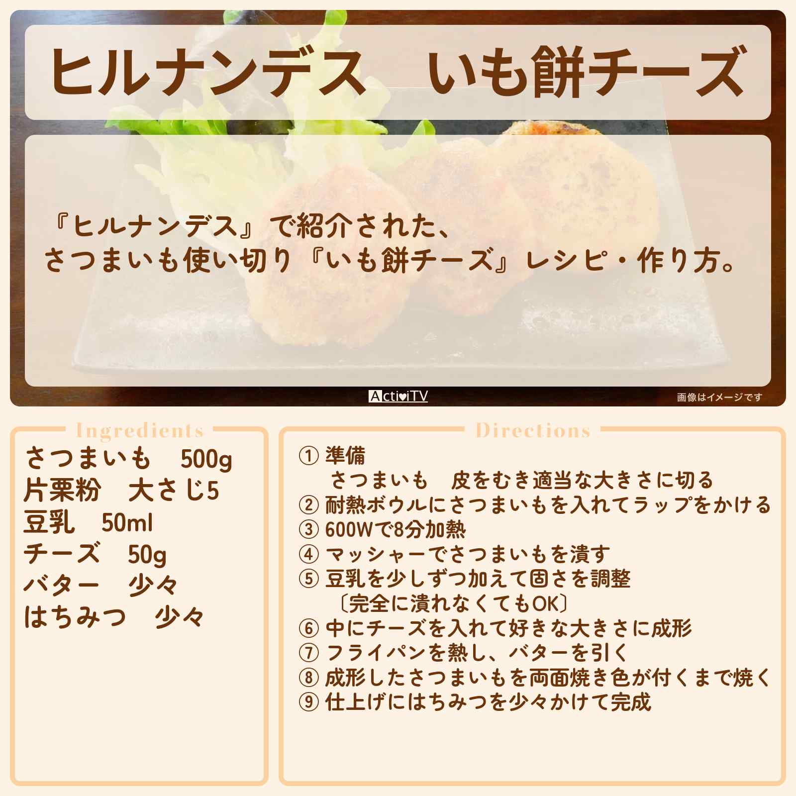 放送の【ヒルナンデス】で紹介された、さつまいも使い切り『いも餅チーズ』レシピ・作り方。