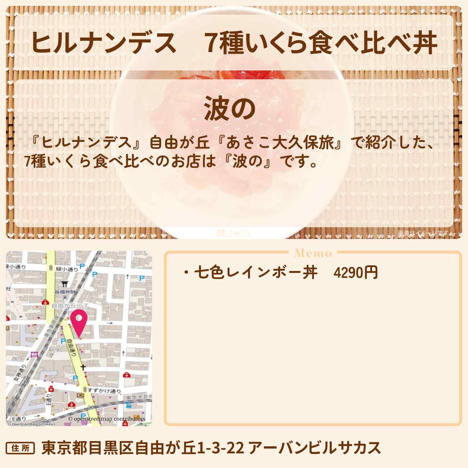 放送の【ヒルナンデス】自由が丘『あさこ大久保旅』で紹介した、7種いくら食べ比べのお店は『波の』です。
