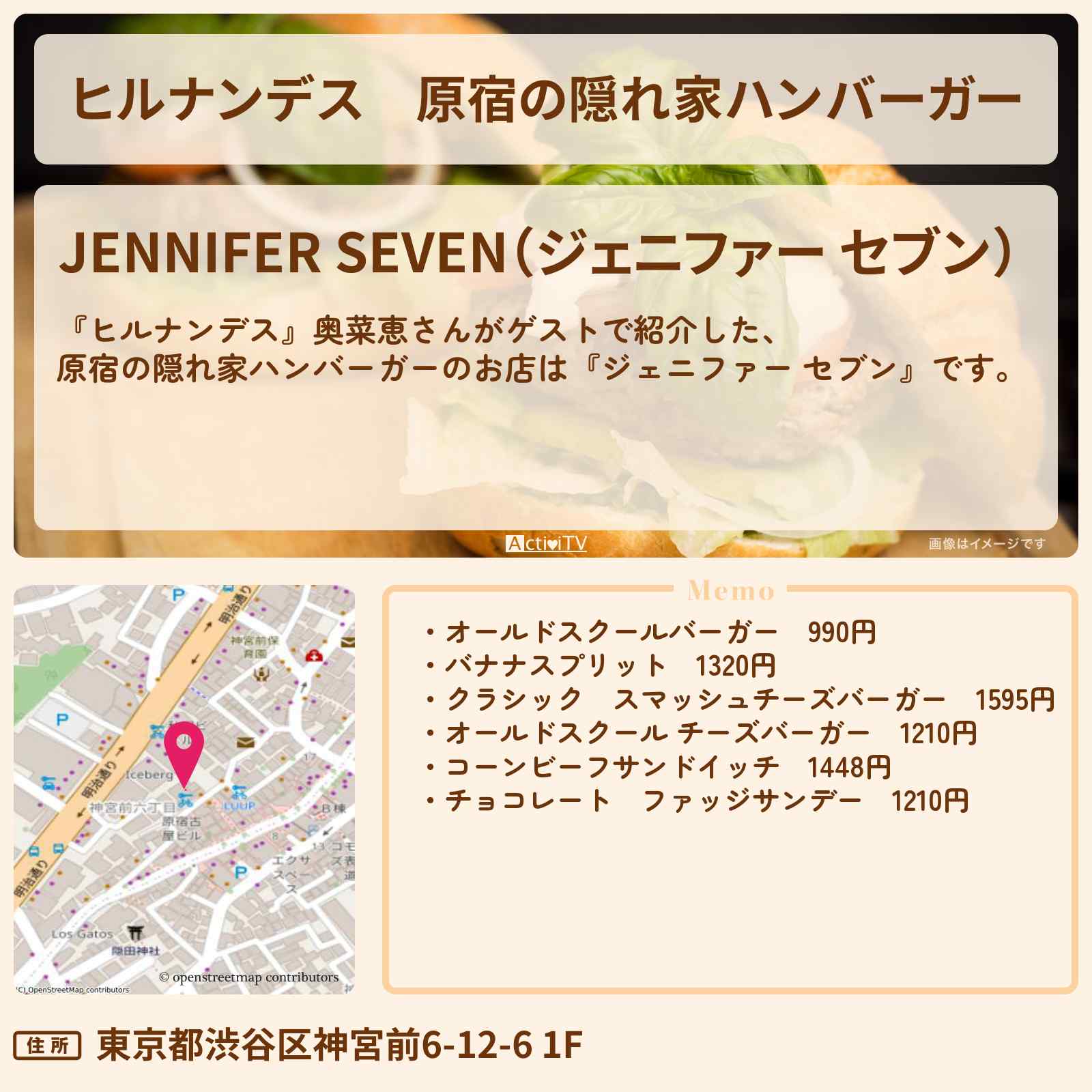 放送の【ヒルナンデス】奥菜恵さんがゲストで紹介した、原宿の隠れ家ハンバーガーのお店は『ジェニファー セブン』です。