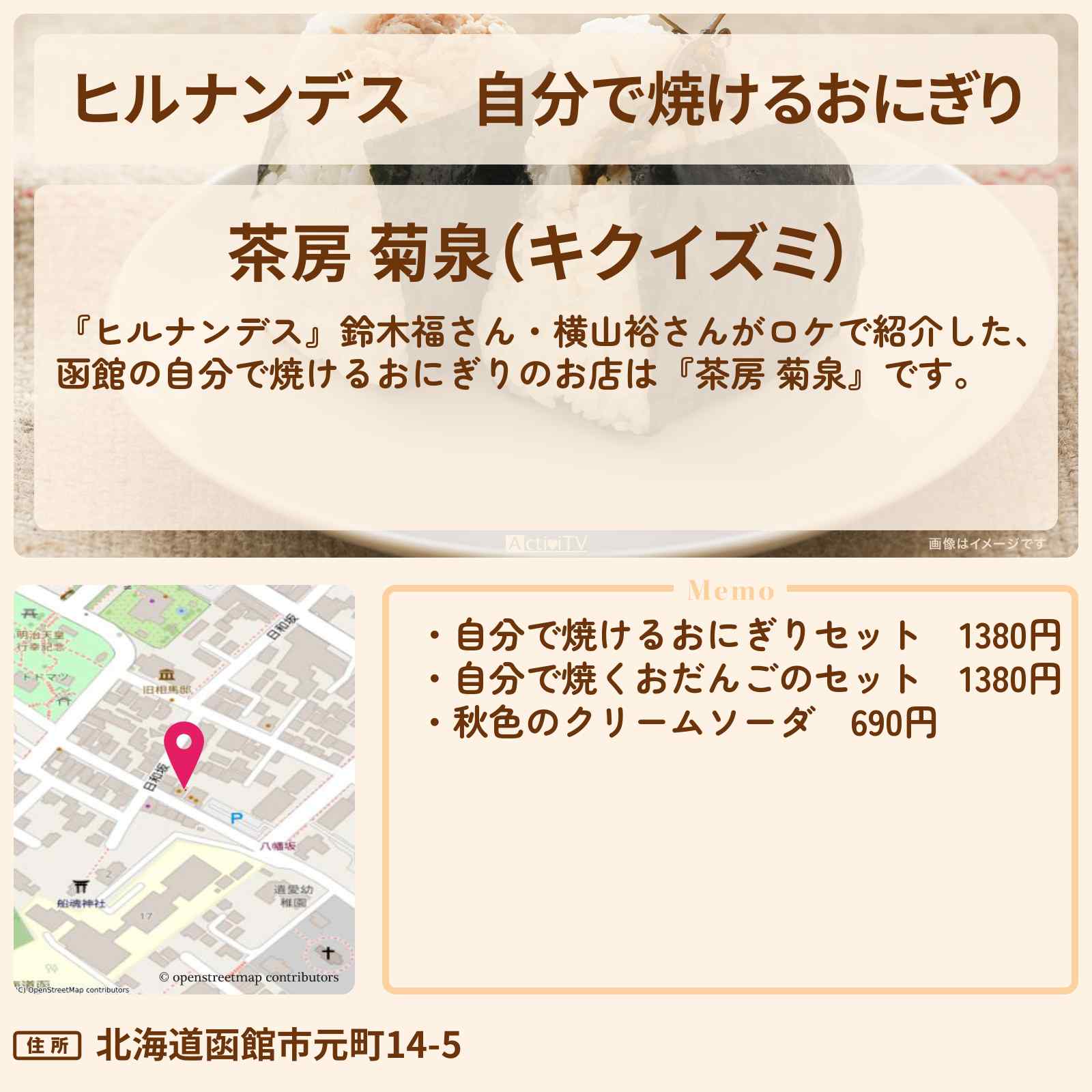 放送の【ヒルナンデス】鈴木福さん・横山裕さんがロケで紹介した、函館の自分で焼けるおにぎりのお店は『茶房 菊泉』です。