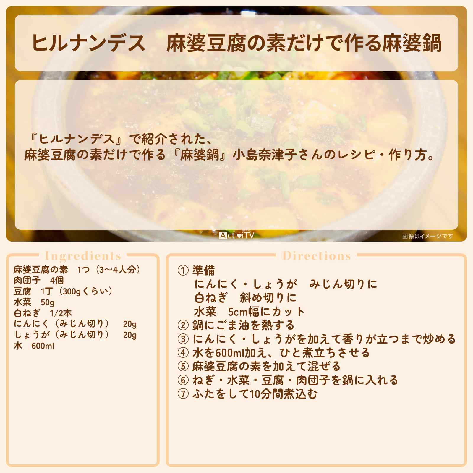放送の【ヒルナンデス】で紹介された、麻婆豆腐の素だけで作る『麻婆鍋』小島奈津子さんのレシピ・作り方。