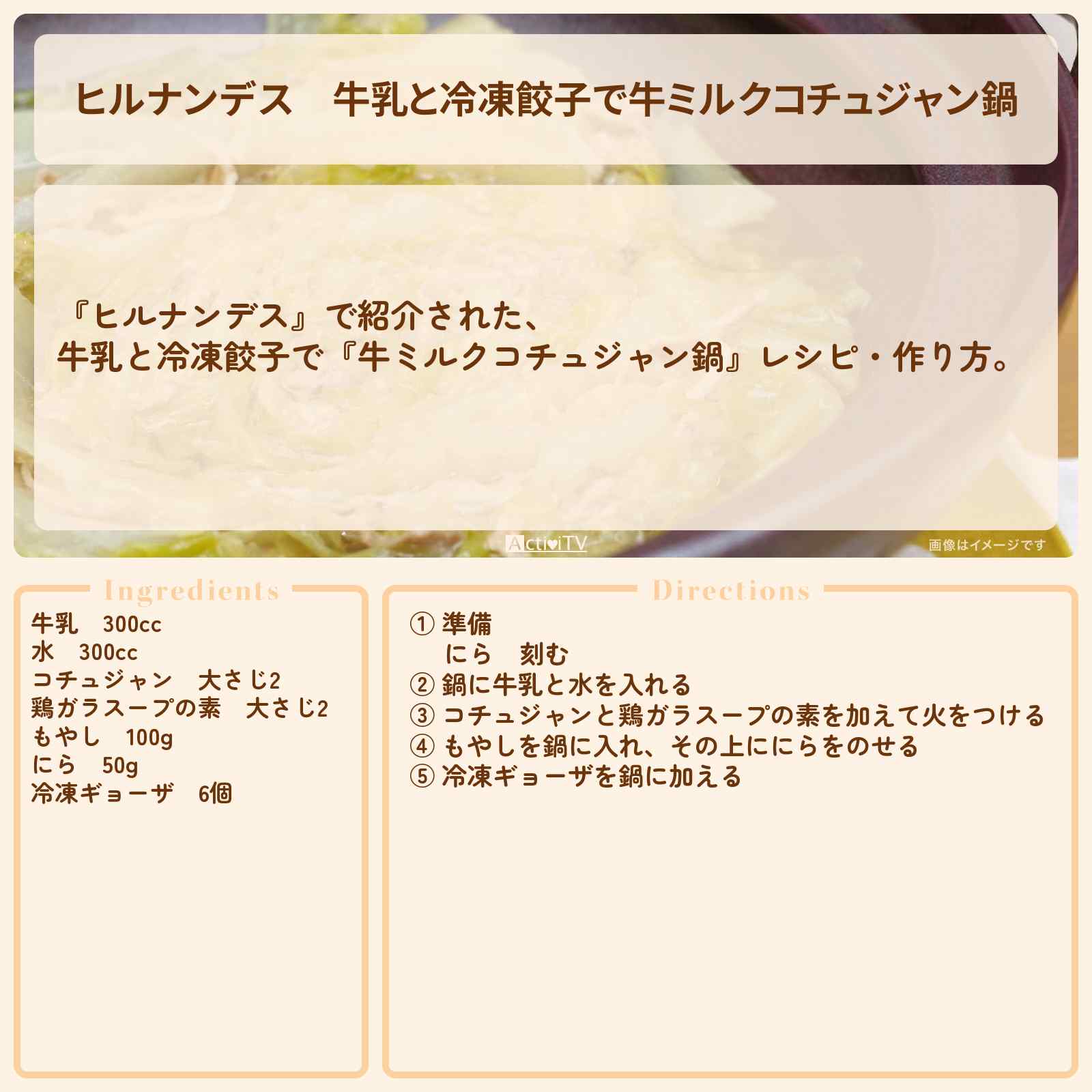 放送の【ヒルナンデス】で紹介された、牛乳と冷凍餃子で『牛ミルクコチュジャン鍋』レシピ・作り方。
