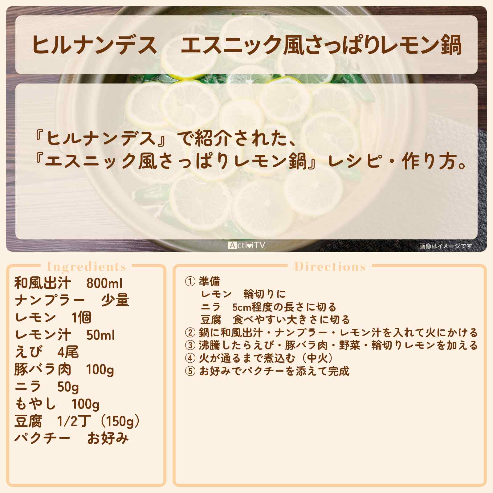 放送の【ヒルナンデス】で紹介された、『エスニック風さっぱりレモン鍋』レシピ・作り方。