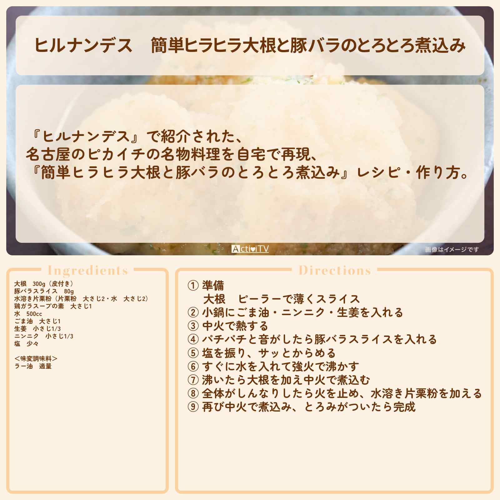 放送の【ヒルナンデス】で紹介された、名古屋のピカイチの名物料理を自宅で再現、『簡単ヒラヒラ大根と豚バラのとろとろ煮込み』レシピ・作り方。
