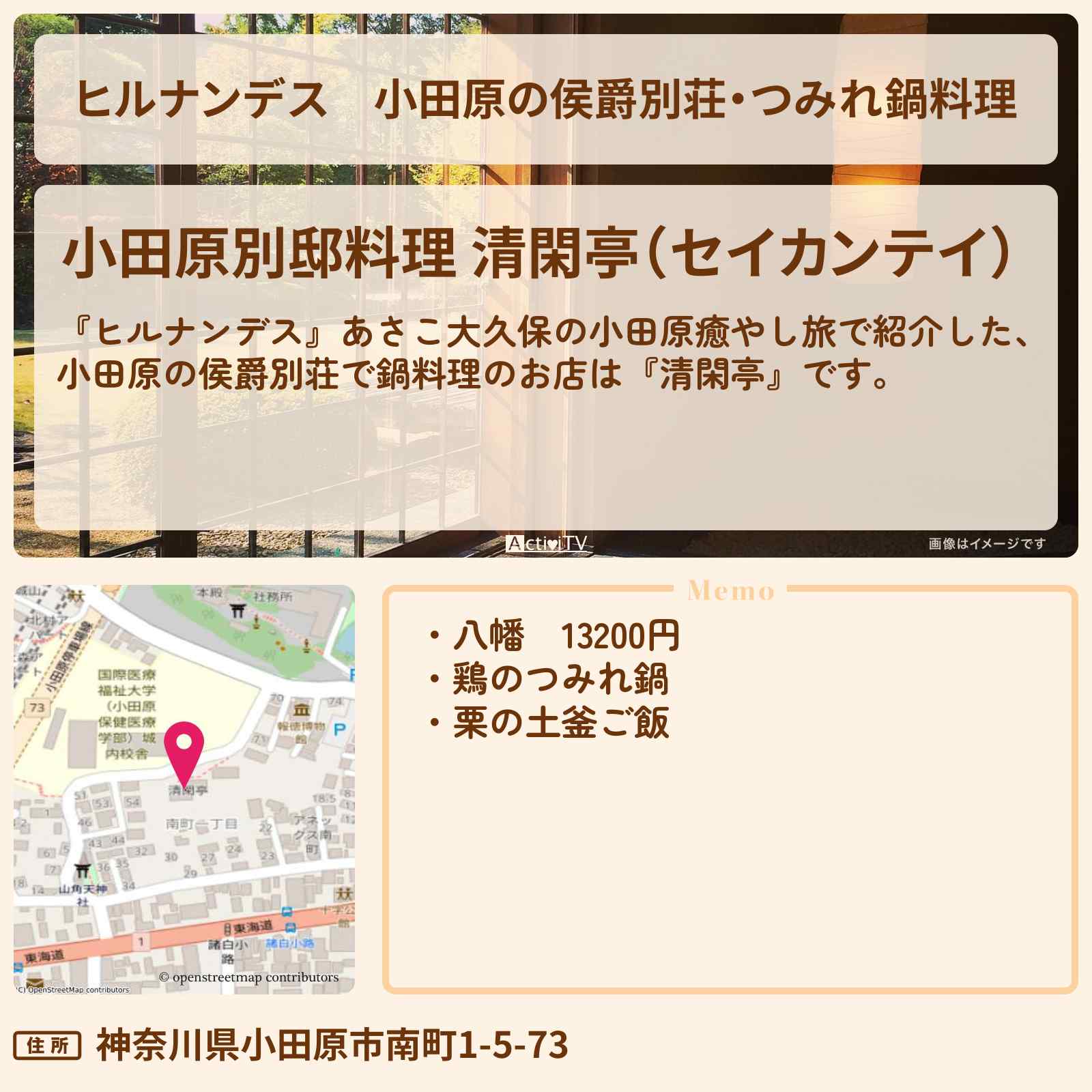 小田原別邸料理 清閑亭 – 小田原にある国指定史跡・国登録有形文化財「旧・黒田長成侯爵別邸」に暖簾を構える すっぽん料理・水炊き料理・二十四節気を基にした別邸料理をコースで提供する日本料理屋、併設する蔵にてカフェも営業しております。…