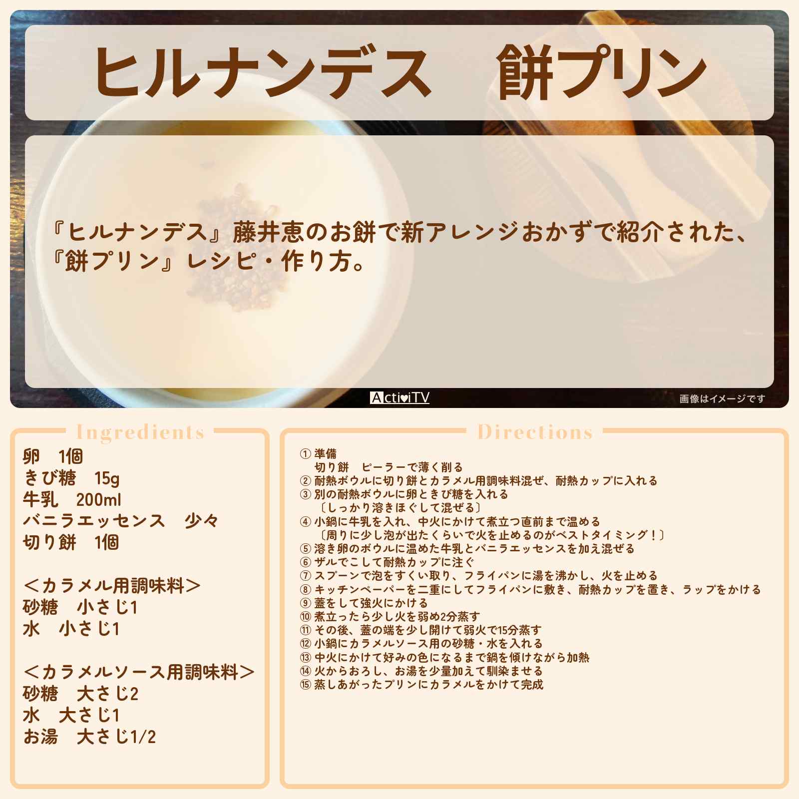 放送の【ヒルナンデス】藤井恵のお餅で新アレンジおかずで紹介された、『餅プリン』レシピ・作り方。