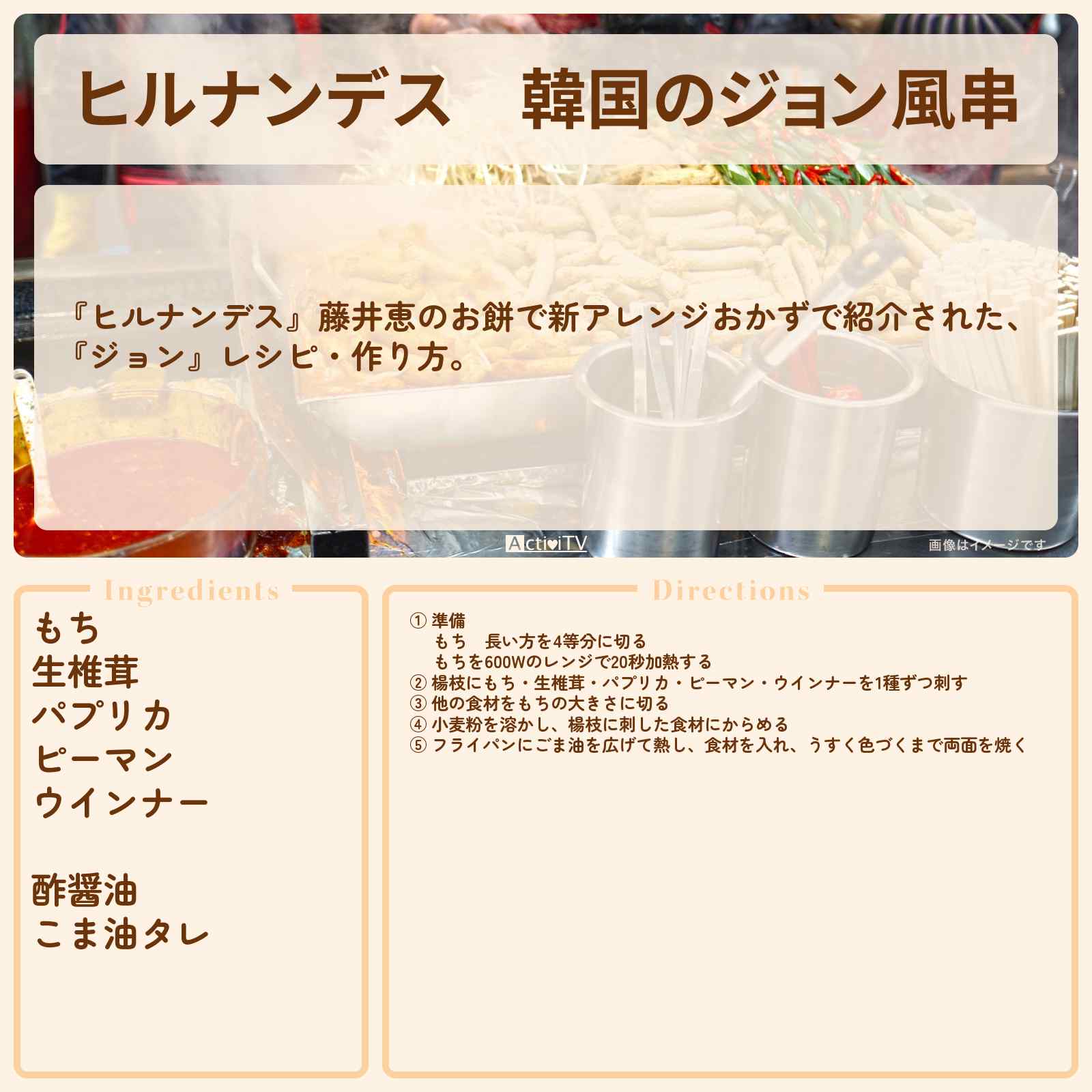 放送の【ヒルナンデス】藤井恵のお餅で新アレンジおかずで紹介された、『ジョン』レシピ・作り方。