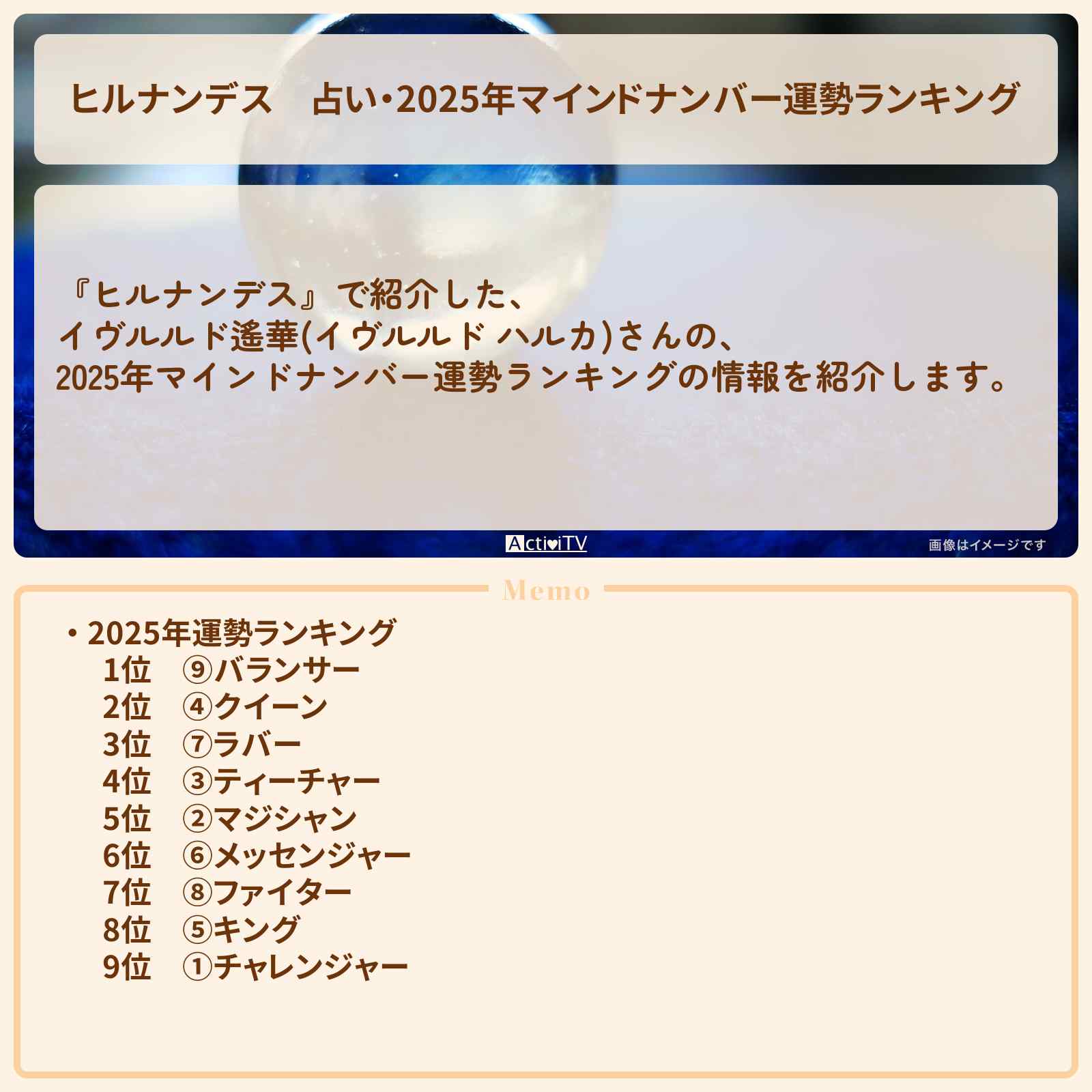 放送の【ヒルナンデス】で紹介した、イヴルルド遙華(イヴルルド ハルカ)さんの、2025年マインドナンバー運勢ランキングの情報を紹介します。
