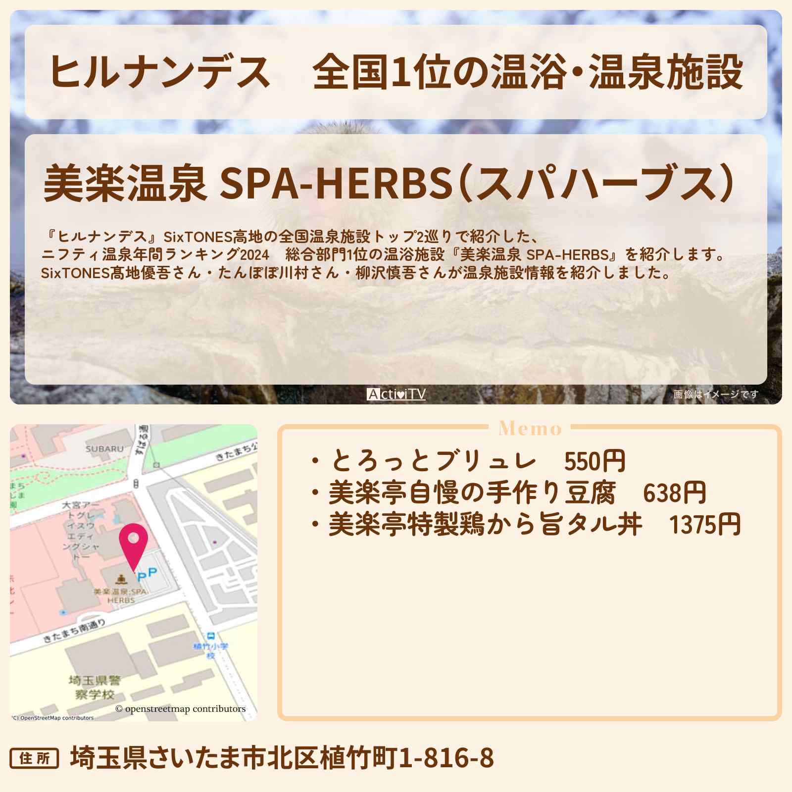 美楽温泉 SPA-HERBSのチケット予約・割引クーポンならじゃらん遊び・体験予約 営業期間:営業時間:9:00~25:00(最終入館受付24:00)岩盤浴は異なる、交通アクセス:(1)無料シャトルバス:JR大宮駅より。美楽温泉 SPA-H…