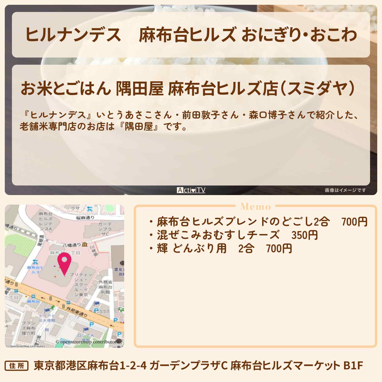放送の【ヒルナンデス】いとうあさこさん・前田敦子さん・森口博子さんで紹介した、老舗米専門店のお店は『隅田屋』です。