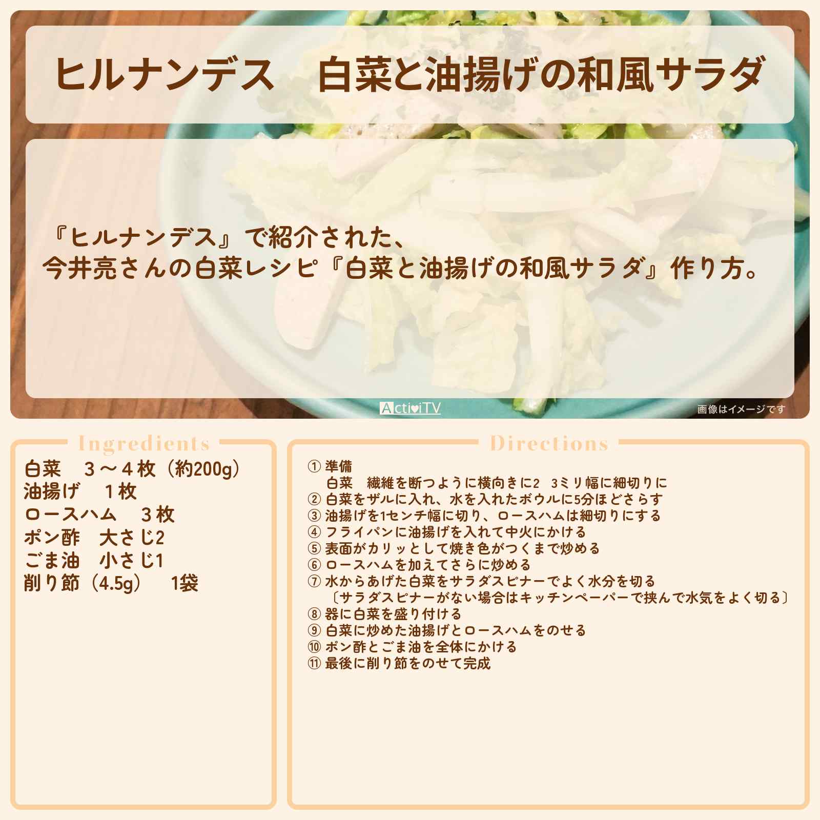 放送の【ヒルナンデス】で紹介された、今井亮さんの白菜レシピ『白菜と油揚げの和風サラダ』作り方。