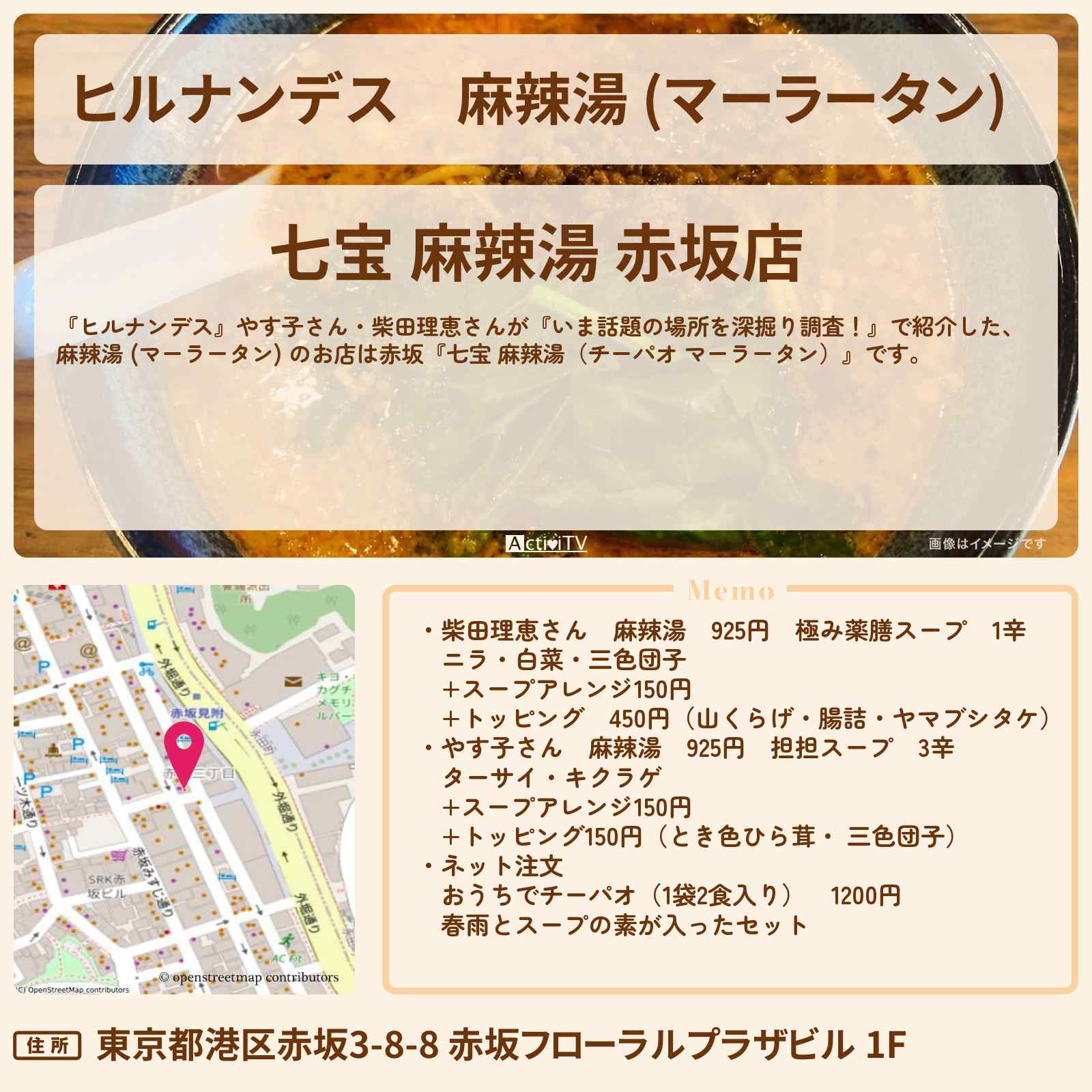 放送の【ヒルナンデス】やす子さん・柴田理恵さんが『いま話題の場所を深掘り調査!』で紹介した、麻辣湯 (マーラータン) のお店は赤坂『七宝 麻辣湯(チーパオ マーラータン)』です。