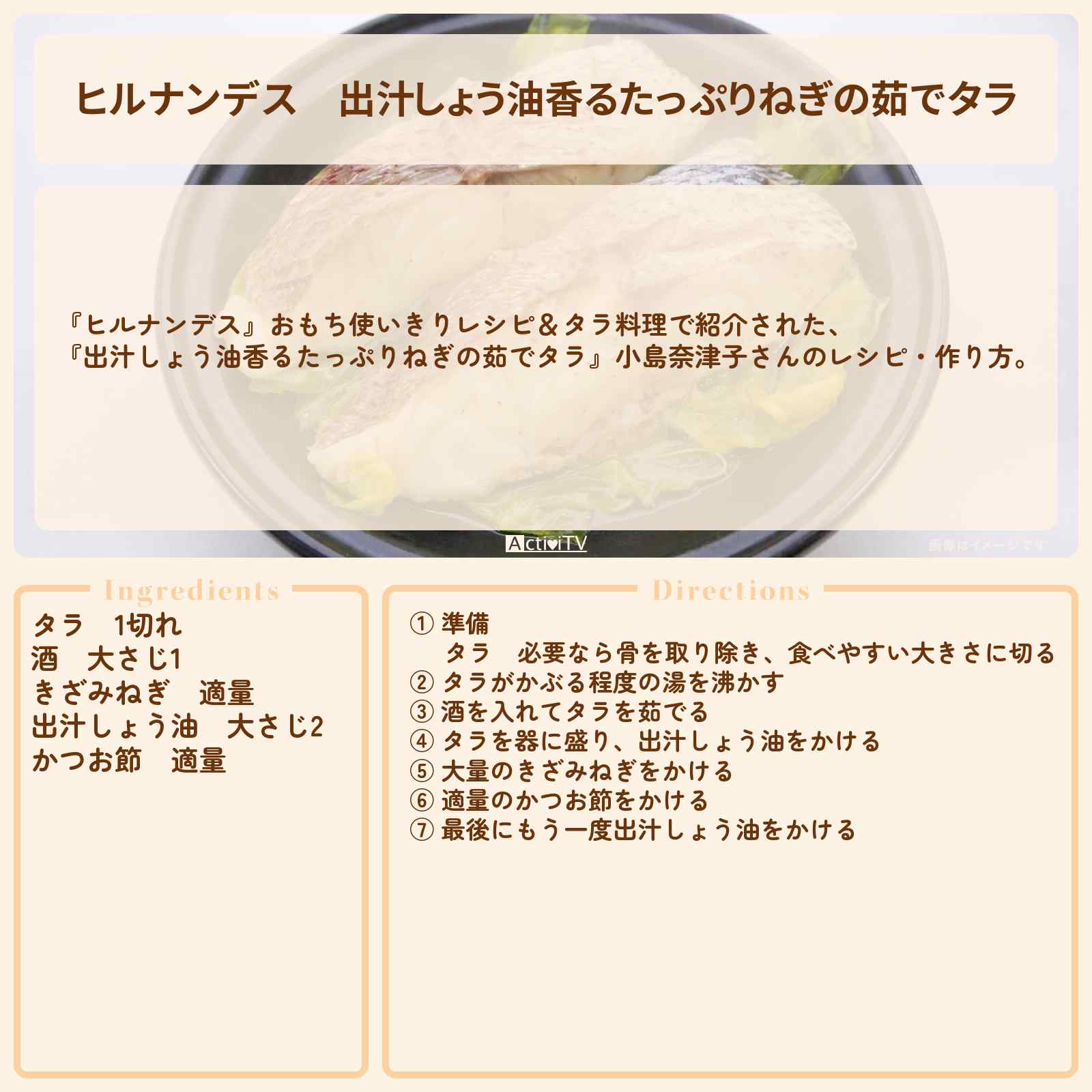 放送の【ヒルナンデス】おもち使いきりレシピ&タラ料理で紹介された、『出汁しょう油香るたっぷりねぎの茹でタラ』小島奈津子さんのレシピ・作り方。