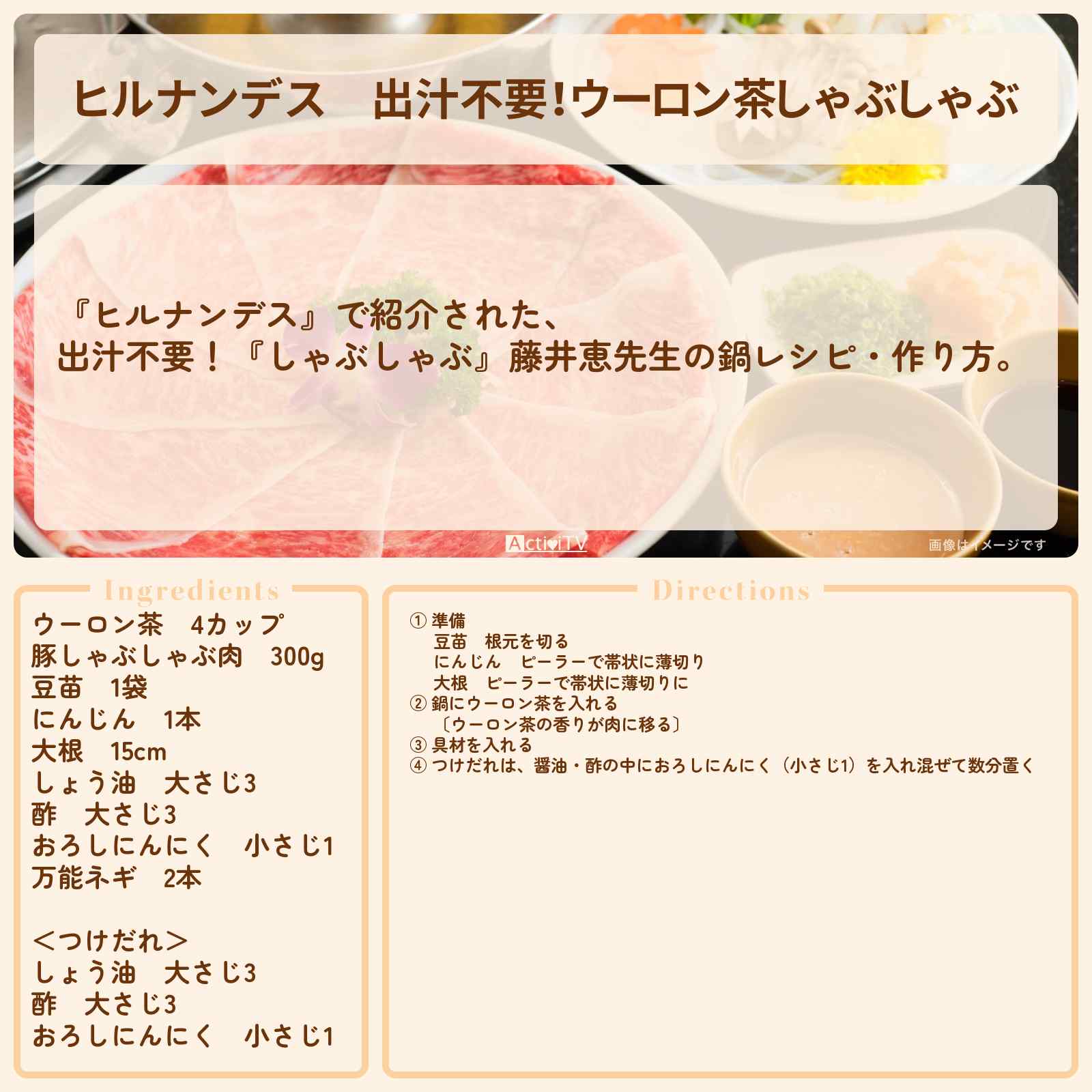 放送の【ヒルナンデス】で紹介された、出汁不要!『しゃぶしゃぶ』藤井恵先生の鍋レシピ・作り方。